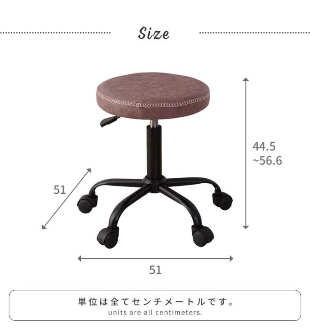| 高級感のあるPVCレザーとブラックの脚がスタイリッシュなキャスター付きスツール。 座面下のレバーを引くだけで、座る人やテーブルの高さに合わせて44.5〜56.6cmの間で無段階に調節できます。 360度回転する座面は座りながら体の向きを変えられるので、モノを取るときや立ち座りなどもスムーズにでき、効率的に作業を行えます。 座ったまま移動ができるキャスター付きでキッチンやデスクで少しだけ移動したい時に便利。 |
