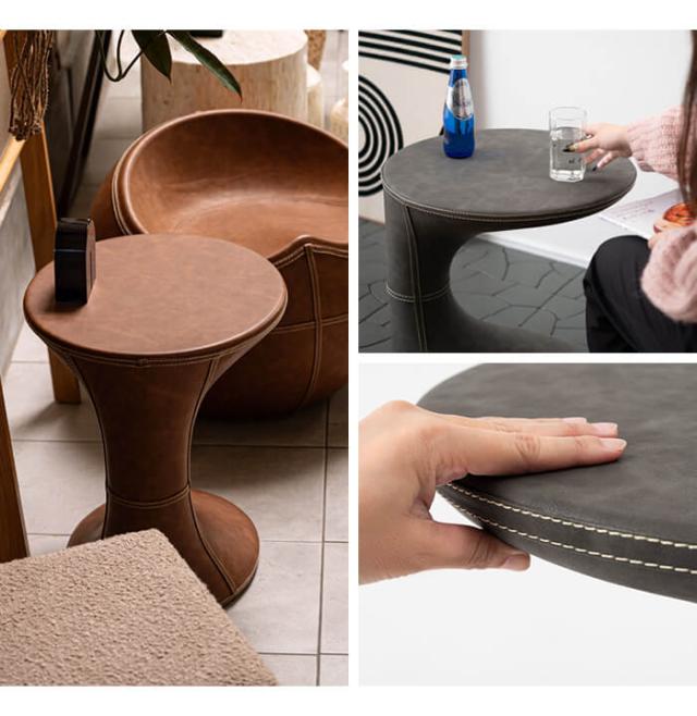 キーワード: サイドテーブル おしゃれ 丸 ソフトレザー ベッド ソファ横 ソファー ソファーサイドテーブル テーブル ラウンド ステッチ 合皮 ブラウン 茶色 グレー モダン ビンテージ ヴィンテージ デザイン 個性的 リビング 玄関 寝室 低め 低い 荷物置き コの字