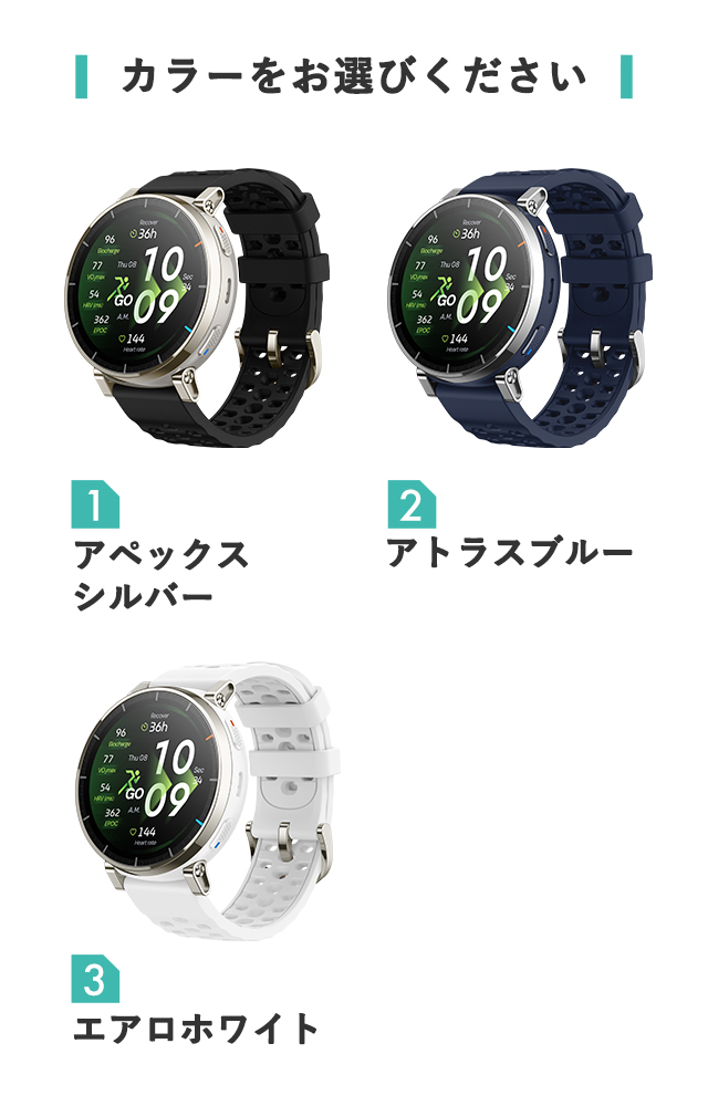 | 仕様 | ・5ATM防水 ・バッテリー -容量:365 mAh -方法:マグネット充電 -想定充電時間:2時間 -通常使用:最大12日間 -ヘビー利用:最大7日間 -GPSモード (単一周波数、複数衛星捕捉、サンプリングレート1秒):最大 24 時間 ・センサー -BioTrackerTM 6.0 PPG 生体センサー (5PD + 2LED) -6軸加速度センサー, 6軸ジャイロスコープ, 温度センサー, 環境光センサー, 地磁気センサー, 気圧高度センサー -Bluetooth 5.3 BLE -6衛星測位システム (GPS, GLONASS, Galileo, BeiDou, QZSSみちびき, NaviC) 円偏波GPSアンテナ ・ディスプレイ -素材:AMOLED 3,000Nit -サイズ:1.32” -解像度:466 x 466 -1 inch あたりのPixel数:353 ・マイク機能 ・リニアモーター ・スピーカー ・Android 7.0 以上, iOS 14.0 以上 ・Zepp App |