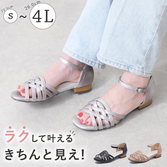 【在庫限り★1,999円!!】 サンダル レディース ストラップ オープントゥ ローヒール ぺたんこ かかとあり 編み込み 歩きやすい 痛くない 柔らかい 脱げない 疲れない 軽量 軽い 走れる 滑らない オフィス 仕事 大きいサイズ 黒 ブラック シルバー きれいめ おしゃれ かわいい