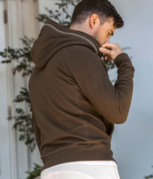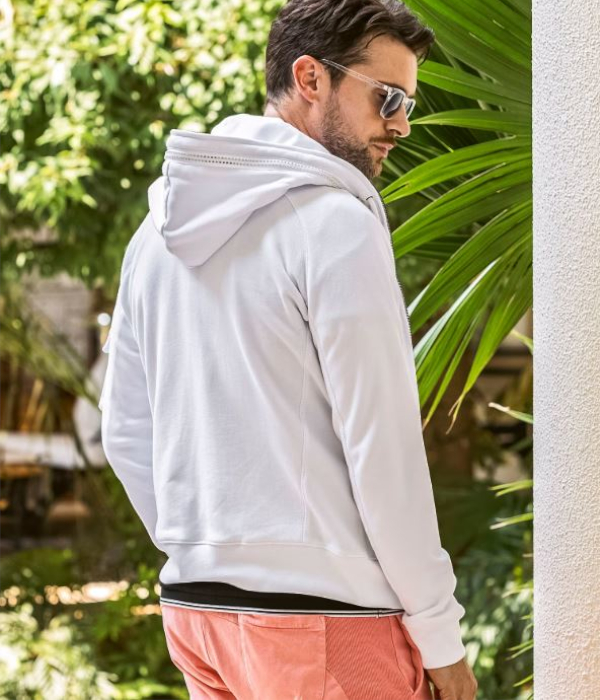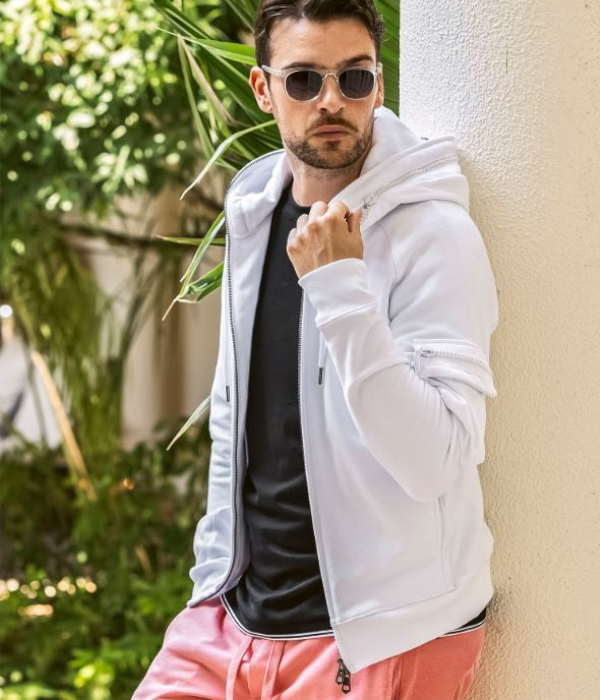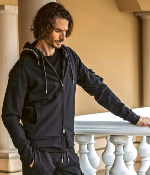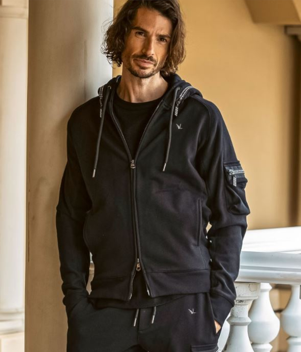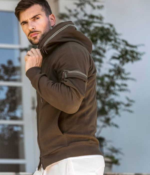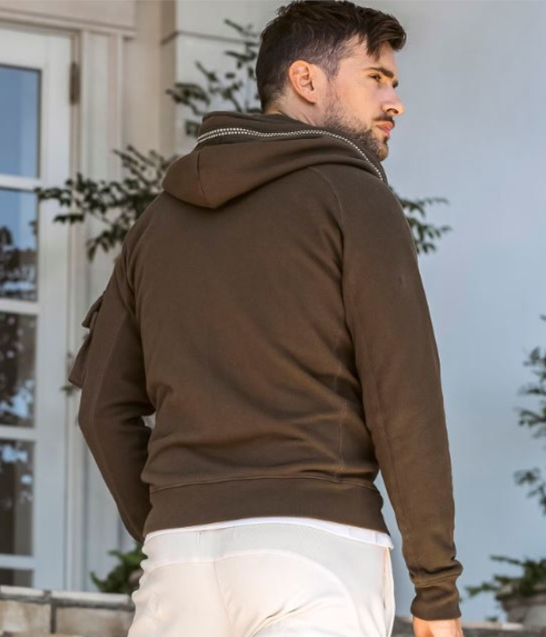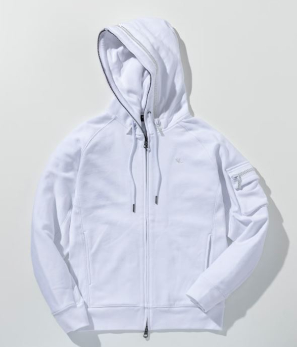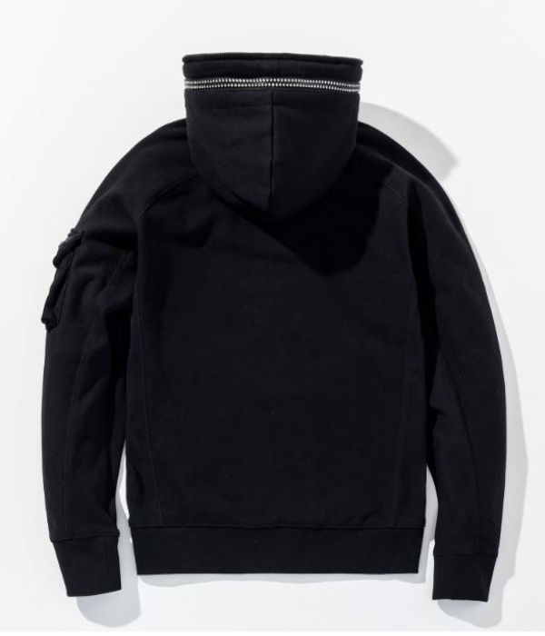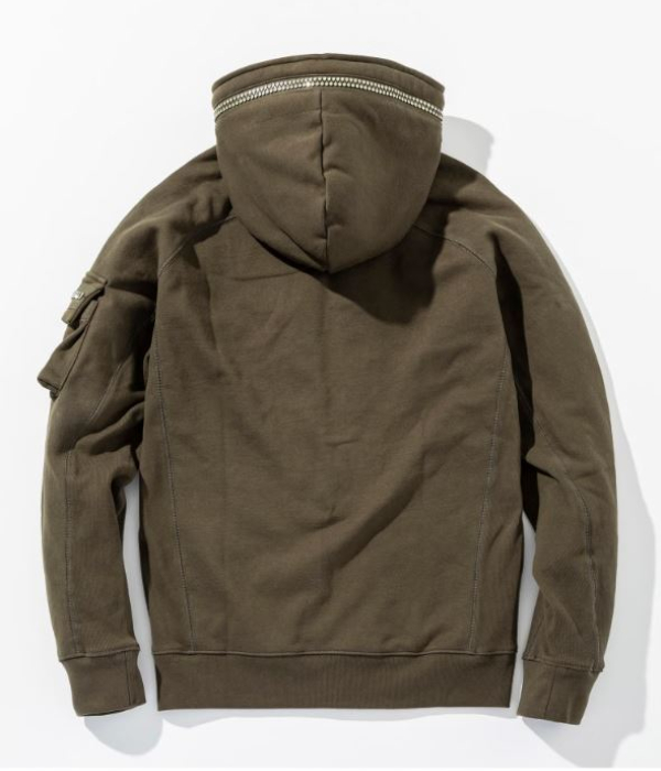 左袖にカーゴポケットを配置したジップアップフーディー。