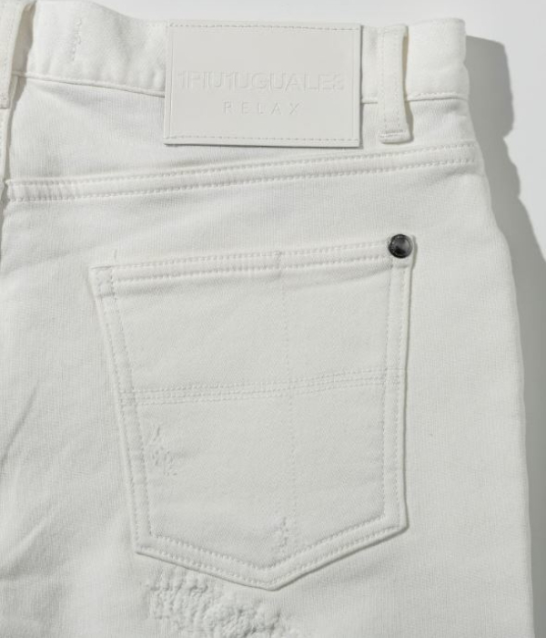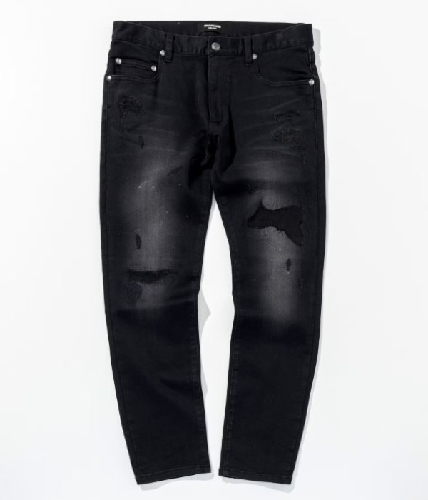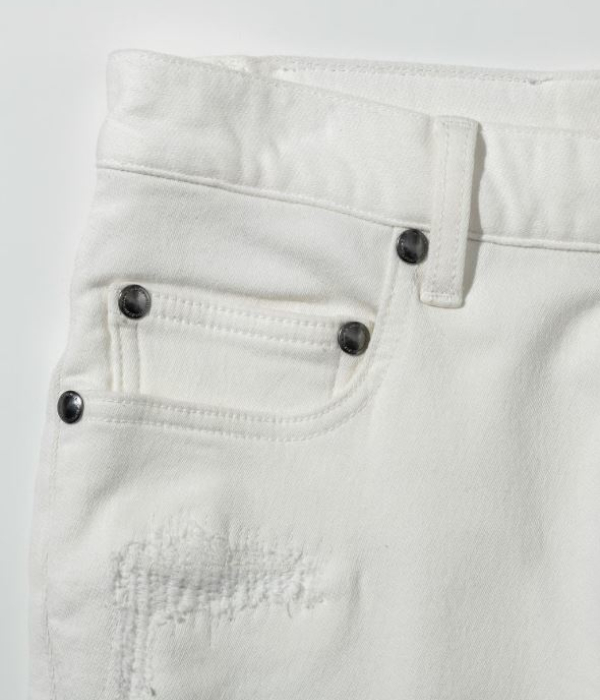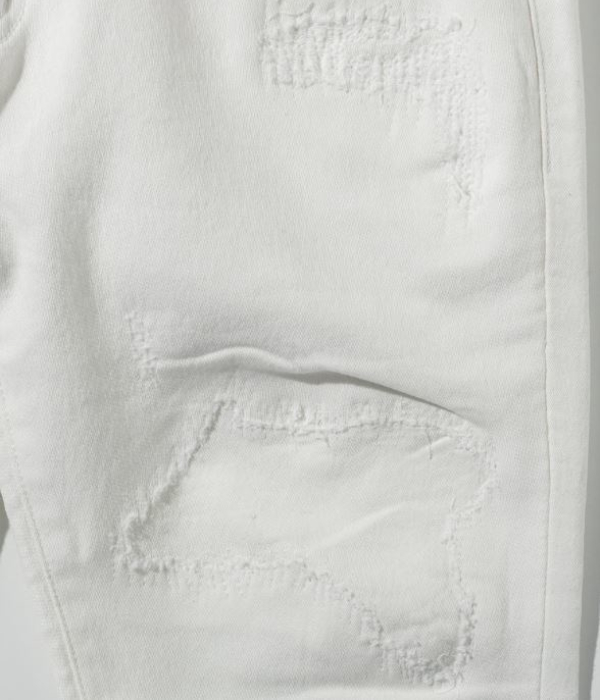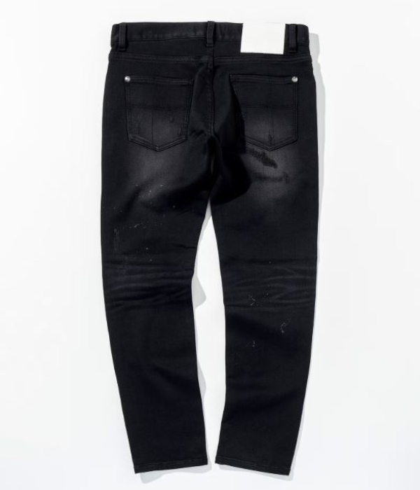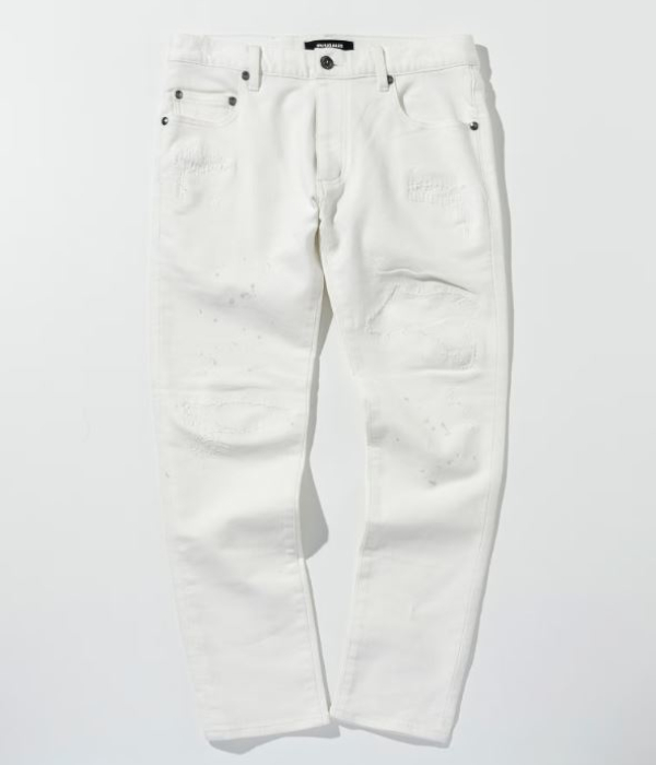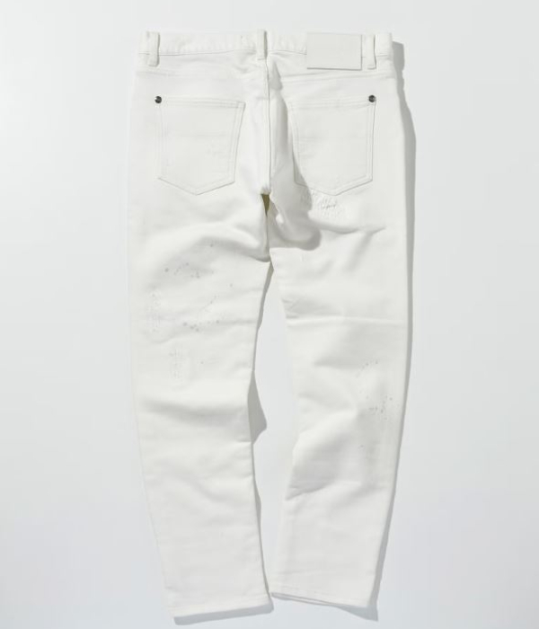 薄く散らしたペイント加工とこだわりのダメージが、やりすぎない大人のこなれ感を演出。