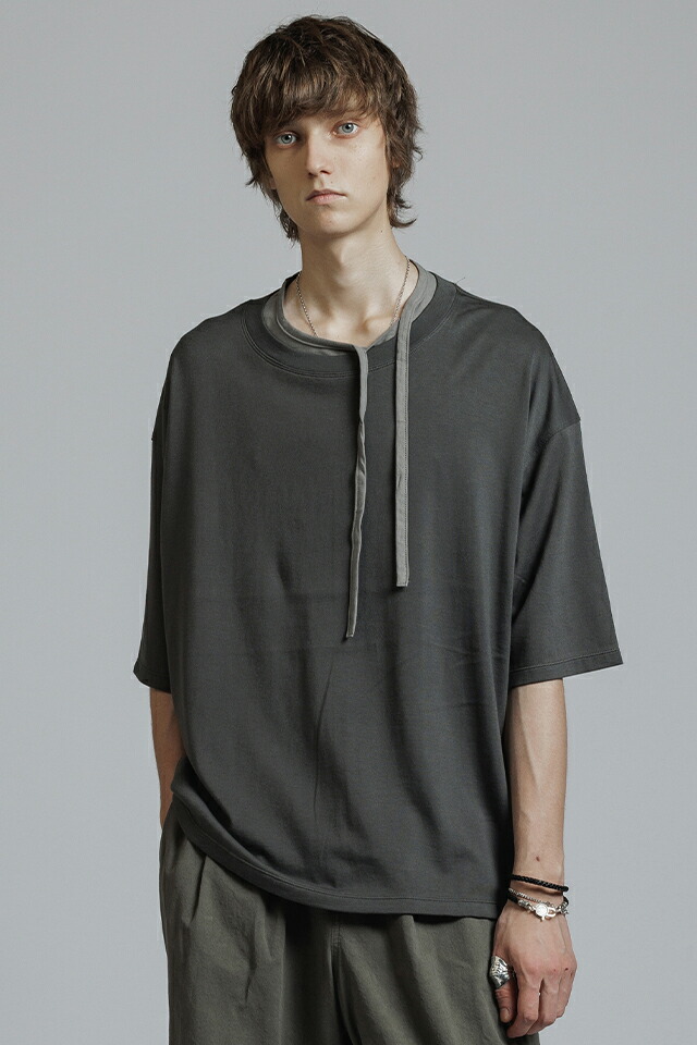 ネックがレイヤード風になっており、バインダーが長く垂れ下がったデザインの半袖Tシャツです。
