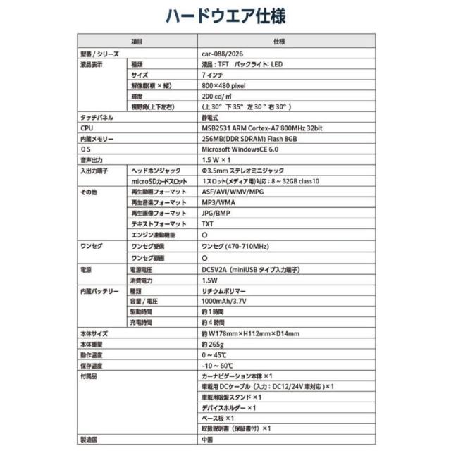 ■セット内容:カーナビゲーション本体、車載用DCケーブル(入力:DC12/24V 車対応)、車載用吸盤スタンド、ベース板、取扱説明書