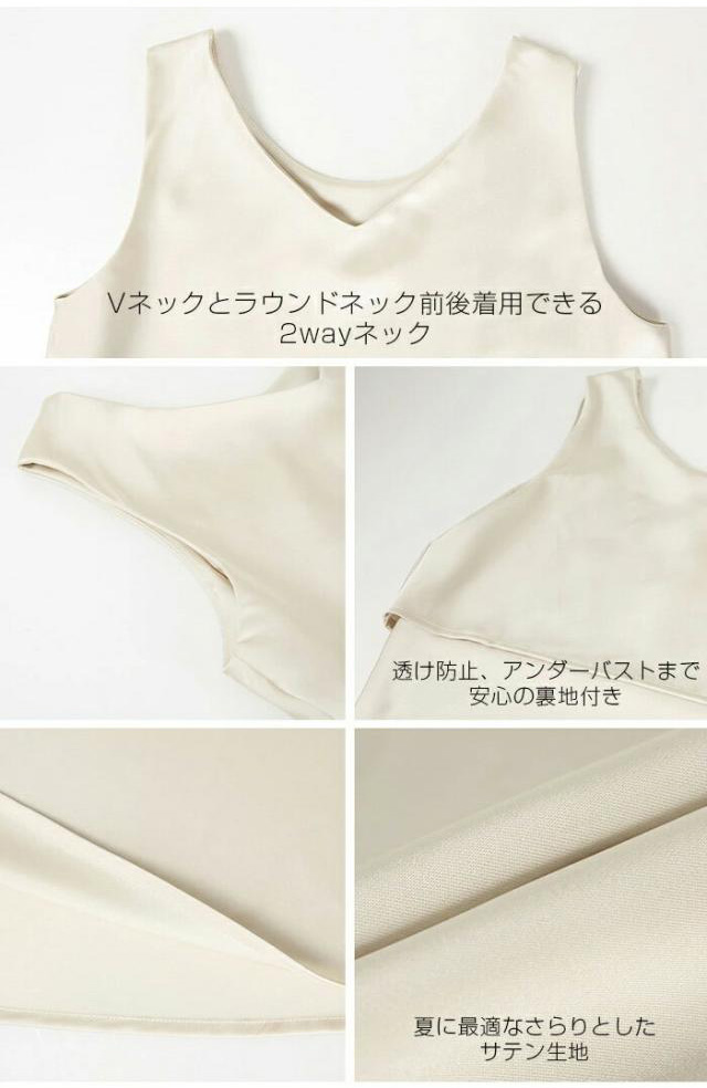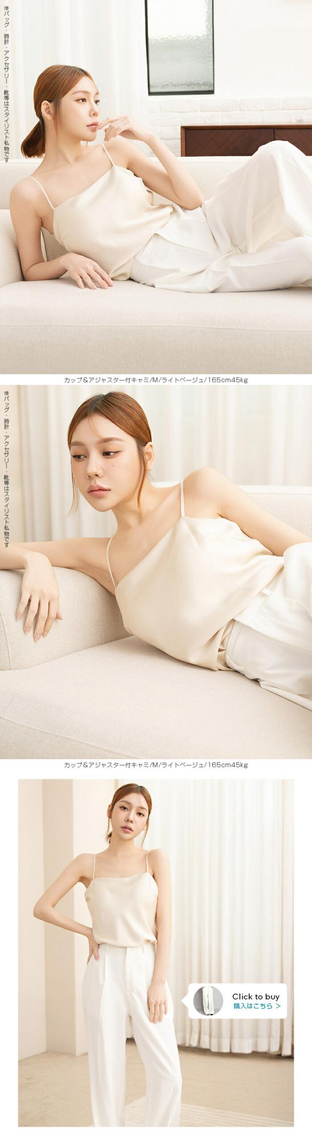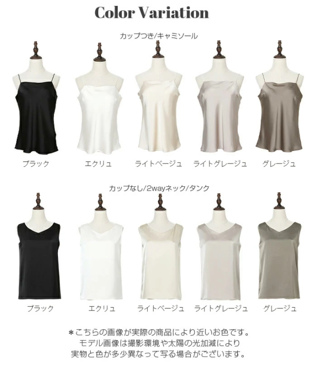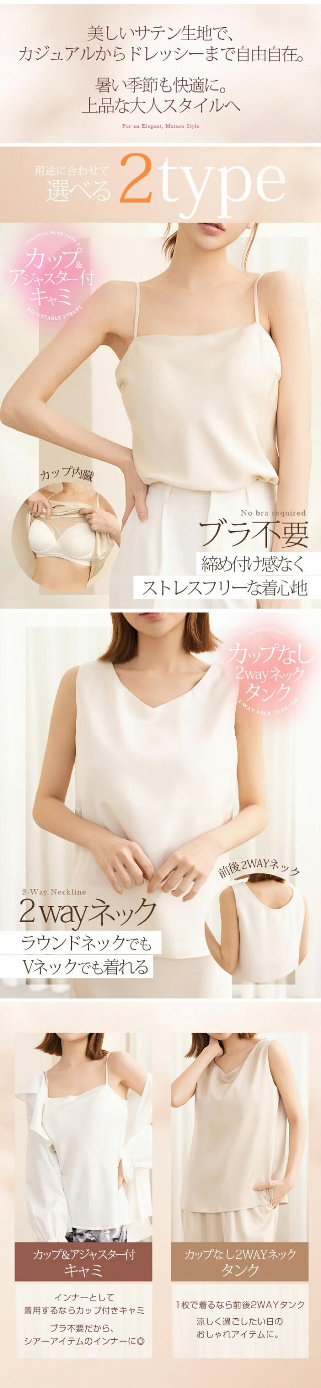 【カップ付きサテンキャミ&前後2wayサテンタンク】 サテン素材で肌触りが良く、リラックスした着心地で人気のサテンシリーズ。 デイリー使いにもおしゃれなコーディネートにもぴったりなアイテムで、シンプルながらも大人の上品さを引き立てます。 カップ付きサテンキャミ は、ブラジャーなしでも安心して着られるカップ付きデザイン。 シンプルでありながらも美しいラインを作り、 どんなスタイルにも合わせやすいアイテムです。 前後2wayサテンタンク は、前後どちらでも着用可能な便利なデザイン。 シンプルでありながらも着回しが効き、 どんなシーンにも対応可能です。 《商品ポイント》 カップ付きサテンキャミ: カップ付きでブラジャーなしでも安心 軽やかなサテン素材で肌触り抜群 シンプルでありながら上品なデザイン 絶妙なフィット感で美しいシルエット 前後2wayサテンタンク: 前後どちらでも着用可能な2wayデザイン しっとりとしたサテン生地で涼しさをキープ ストレートシルエットでリラックスした着心地 シンプルで着回しやすい 《デザイン・シルエット》 カップ付きサテンキャミ:Vネックデザインでデコルテを美しく見せ、肩ひもは細めで軽やかな印象。 美しいサテン生地が、どんなアイテムとも合わせやすく、 大人の上品さを引き立てます。 前後2wayサテンタンク:シンプルなデザインながら、前後どちらでも着られるので、 気分やコーディネートに合わせて使えます。 ストレートシルエットで、どんなボトムとも相性抜群です。 《コーディネート提案》 カップ付きサテンキャミ:デニムパンツやワイドパンツと合わせてカジュアルダウン ジャケットやスカートと合わせて、ドレッシーに ロングカーディガンやトレンチコートを羽織って、上品な大人のスタイルに ブラ不要だから、シアートップスのインナーにもおすすめ。 前後2wayサテンタンク:デニムやスカートと合わせてシンプルに ボトムスにはワイドパンツやリネンパンツを合わせて、リラックスした日常のスタイル シックなジャケットやカーディガンと合わせて、カジュアルでもフォーマルでも対応 《サイズ・カラーバリエーション》 サイズ:カップ&アジャスター付/キャミ…M / L / XL カップなし/2wayネック/タンク…M / L タイプ:カップ&アジャスター付/キャミ カップなし/2wayネック/タンク カラー:ブラック / ライトベージュ / エクリュ / グレージュ / ライトグレージュ 《素材・機能性》 ・素材:ポリエステル100% ・透け感:ホワイト・淡い色のみ透け感あり ・伸縮性:なし ・厚み:薄手 |