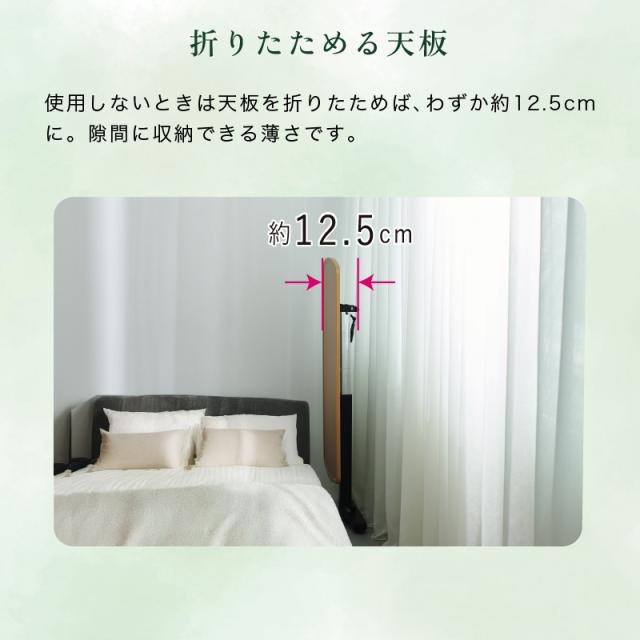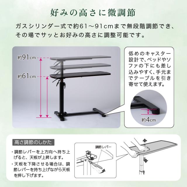 ガスシリンダー式で約61〜91cmまで無段階調節でき、その場でサッとお好みの高さに調整可能。使用しないときは天板を折りたためば、わずか約12.5cmに。