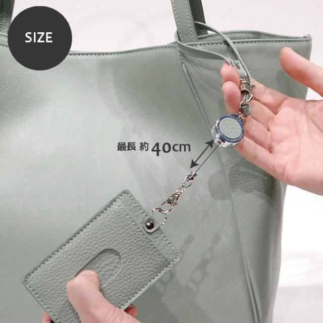 バッグの持ち手に取り付けたまま、リールをスッと伸ばして使用可能。約40cm伸びるので、バスの乗車口や駅の改札、オフィスの入館ゲートでも、バッグを肩にかけたまま自然な動作でタッチ&提示が完了します。