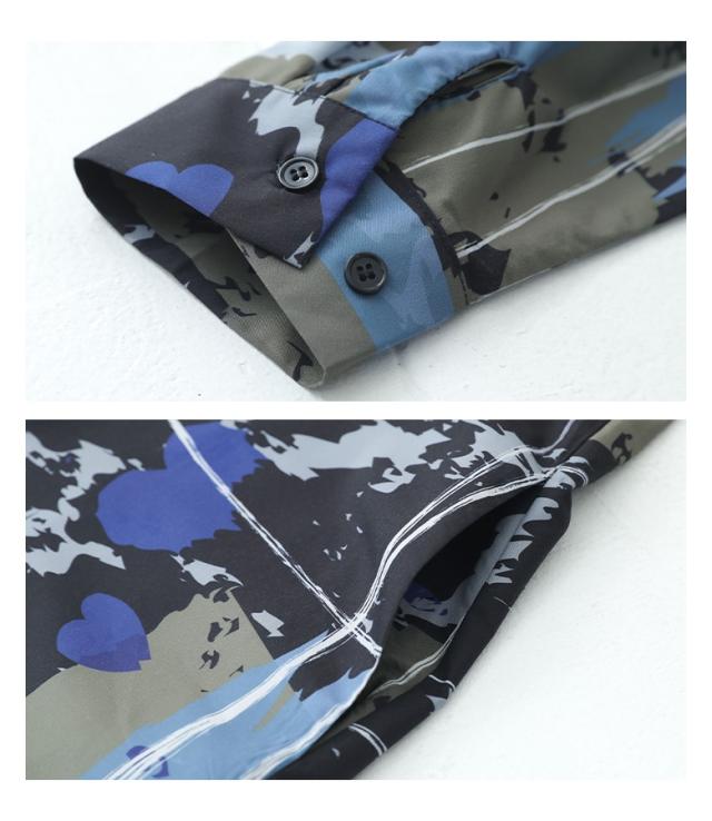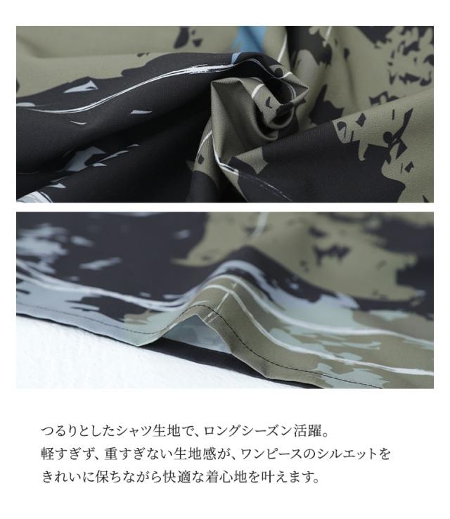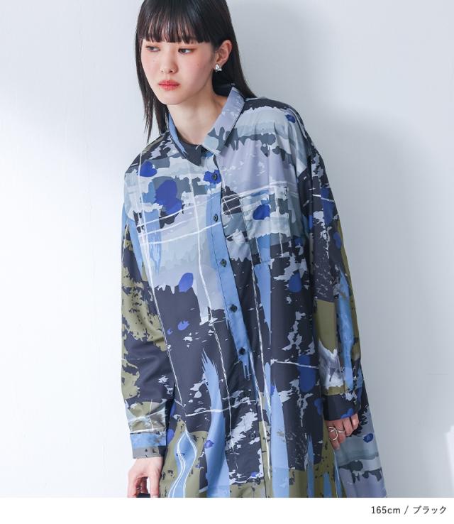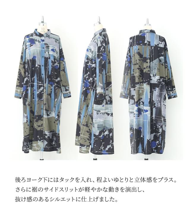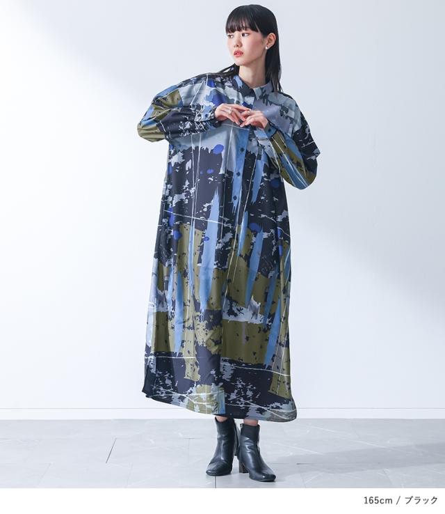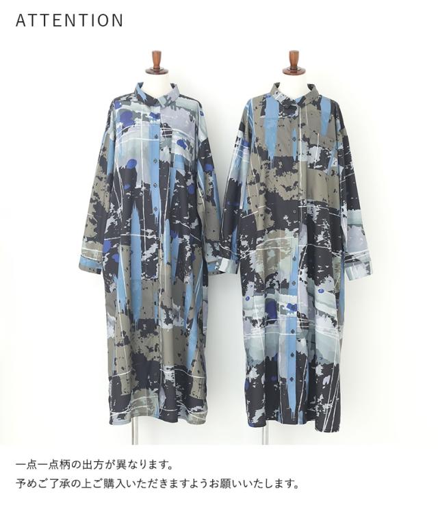 <春新作>『アート柄シャツワンピース』※メール便可※【10】[ワンピース 長袖 レディース ドレス ロング丈 シャツワンピース ロングシャツ 春 秋 羽織 総柄 アート柄 サイドスリット ゆったり 体型カバー]