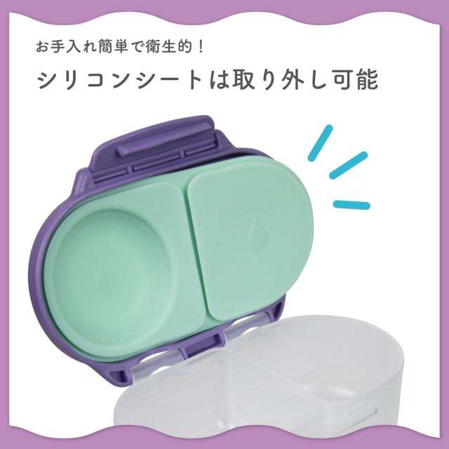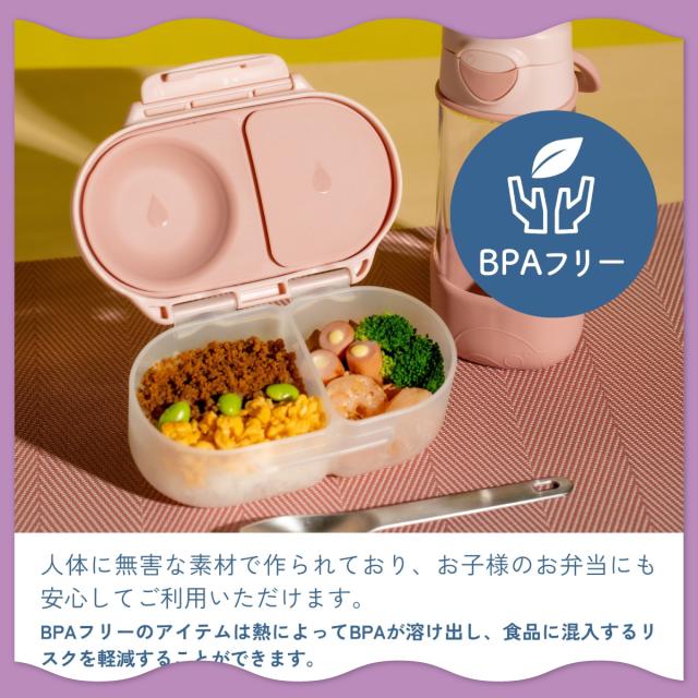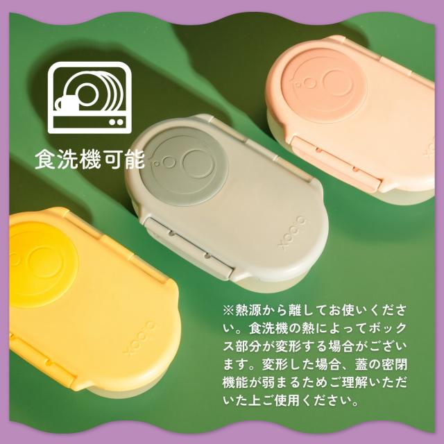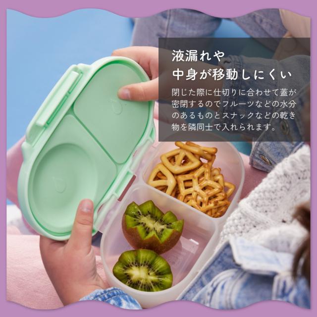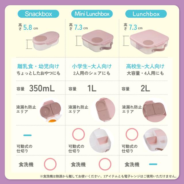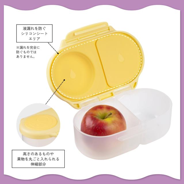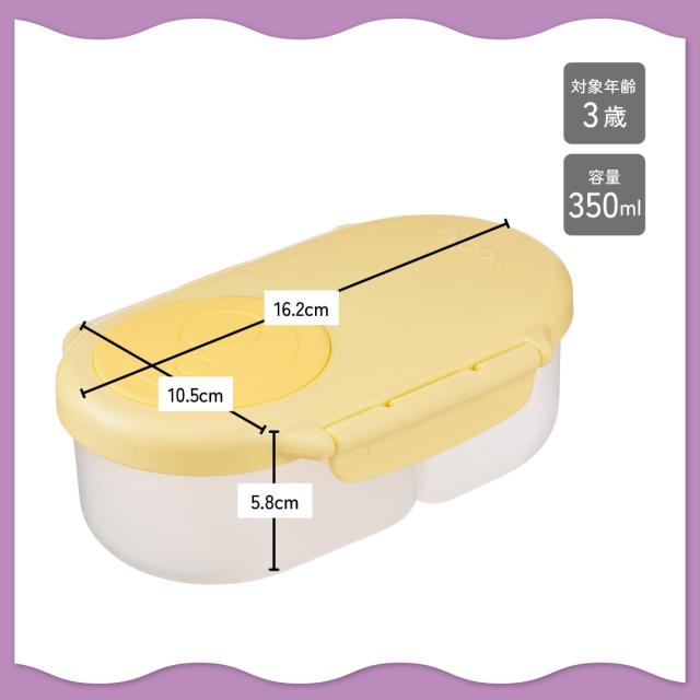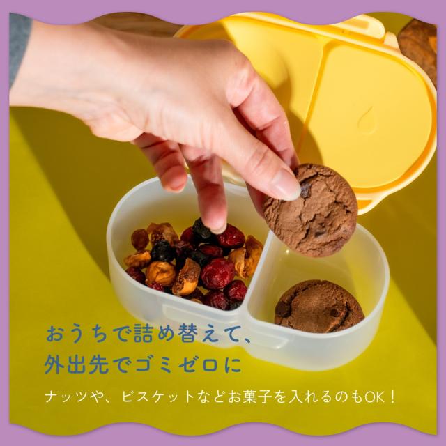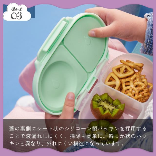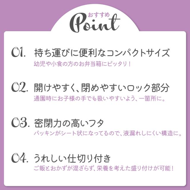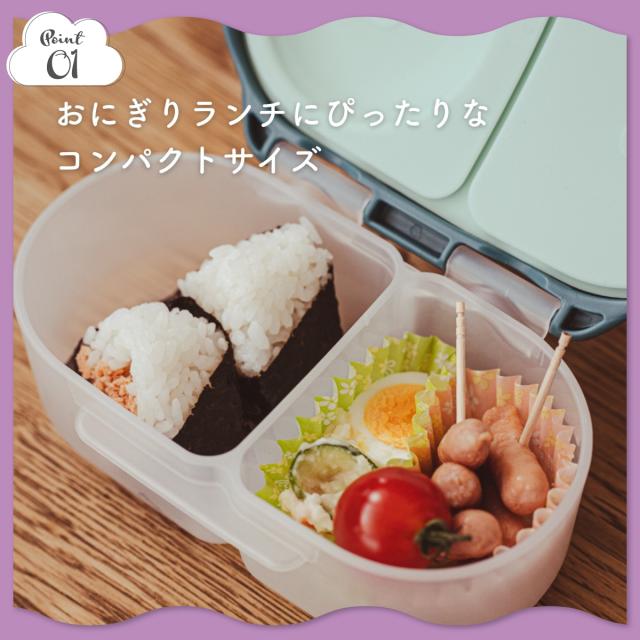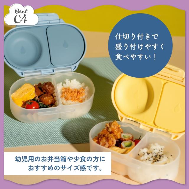 「スナックボックス」は幼児や少食の方のお弁当箱として、または離乳食初期のとろみのある食べ物や外出先でのおやつの持ち運び用のケースとしても便利なコンパクトサイズです。 通園時にお子さんの手でも開けやすく、閉めやすいようにロック部分が一箇所になっています。 さらに、パッキンがシート状になっているので密閉力が高まり、お弁当箱が傾いても液漏れしにくい構造になっています。(※完全に漏れを防ぐものではありません。) 仕切りもあるので、ご飯とおかずの味が混ざらず、栄養を考えた盛り付けをすることができます。 ご注意ください!