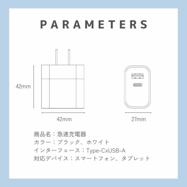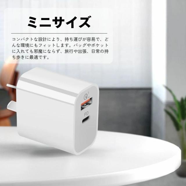 【概要】PD 20W + QC3.0 デュアルポート急速充電器が、あなたのデバイスを効率よく充電します。USB-C ポートは PD3.0 に対応し、iPhone 16/15 シリーズを約 30 分で 50% まで充電可能。USB-A ポートは QC3.0 に対応し、Android スマホやタブレットを高速充電。コンパクトなボディ、持ち運びに便利。旅行や出張に最適です。