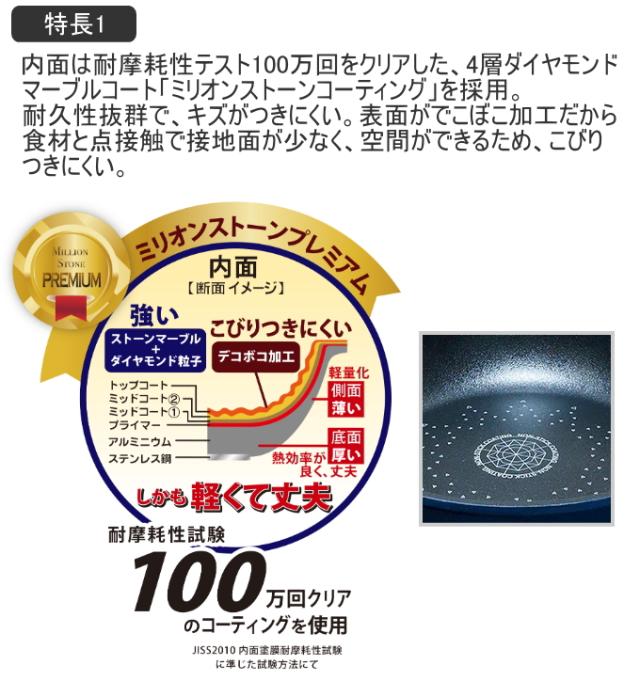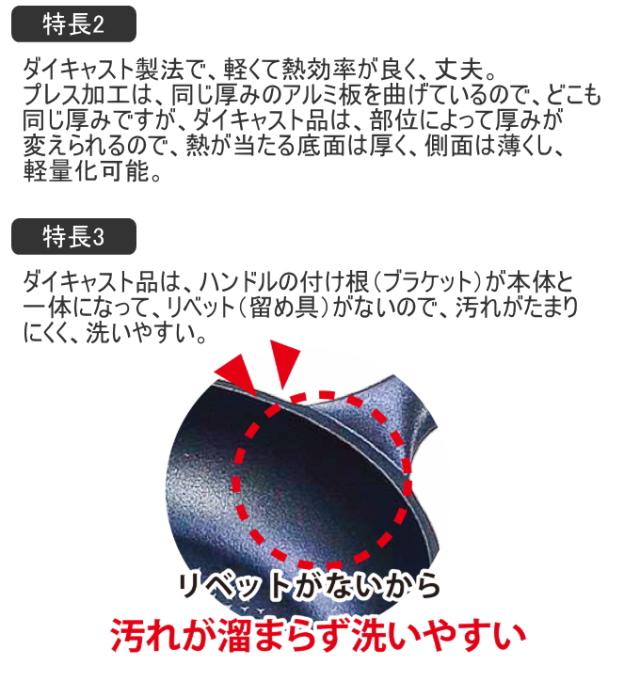 内面は耐摩耗性テスト100万回をクリアした、4層ダイヤモンドマーブルコート「ミリオンストーンコーティング」を採用。 耐久性抜群で、キズが付きにくい。 表面がでこぼこ加工だから、食材と点接触で接地面が少なく、空間ができるため、こびりつきにい。 ダイキャスト製法で、軽くて熱効率が良く丈夫。 プレス加工は、同じ厚みのアルミ板を曲げているので、どこも同じ厚みだが、ダイキャスト品は、部位によって厚みが変えられるので、熱が当たる底面は厚く、側面は薄くし、軽量化可能。 ハンドルの付け根(ブラケット)が本体と一体になって、リベット(留め具)がないので、汚れがたまりにくく、洗いやすい。 |