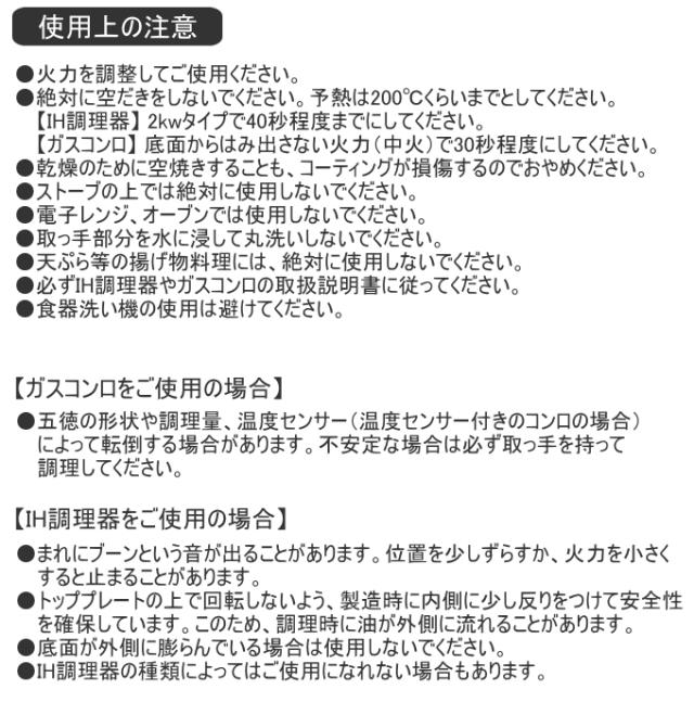 表面加工:内面/ふっ素樹脂塗膜加工 外面/焼付塗装 本体:アルミニウム合金 はり底:ステンレス鋼(クロム16%) 底の厚さ:3.0mm(はり底含む) 取手:フェノール樹脂 |