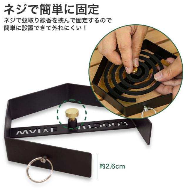 ネジで蚊取り線香を挟んで固定するので、簡単に設置できて外れにくい!