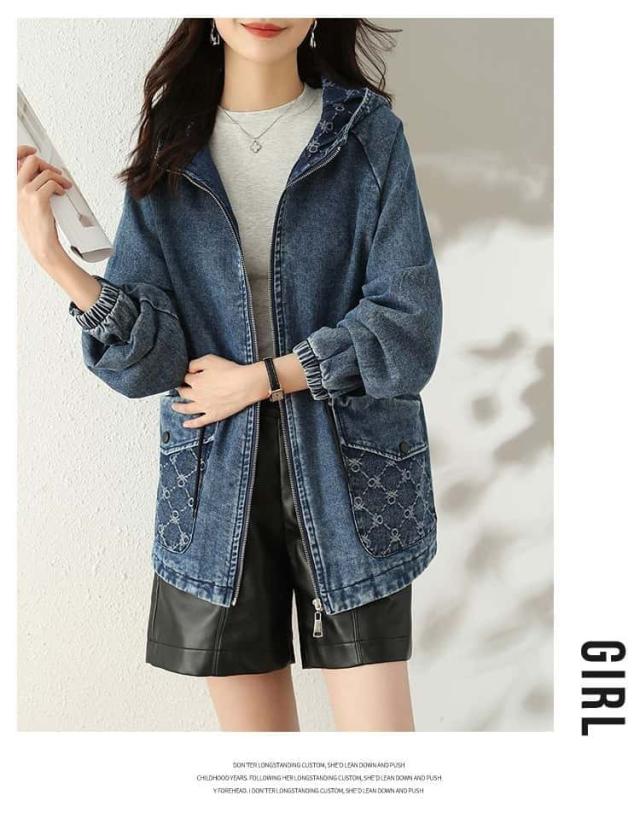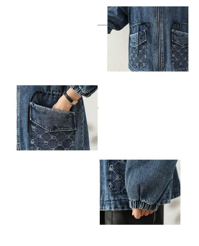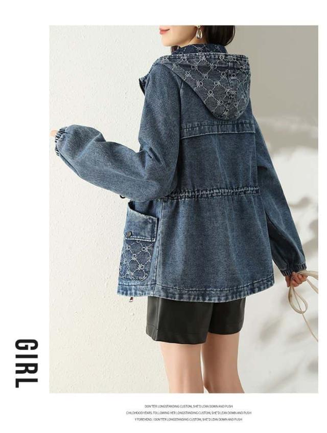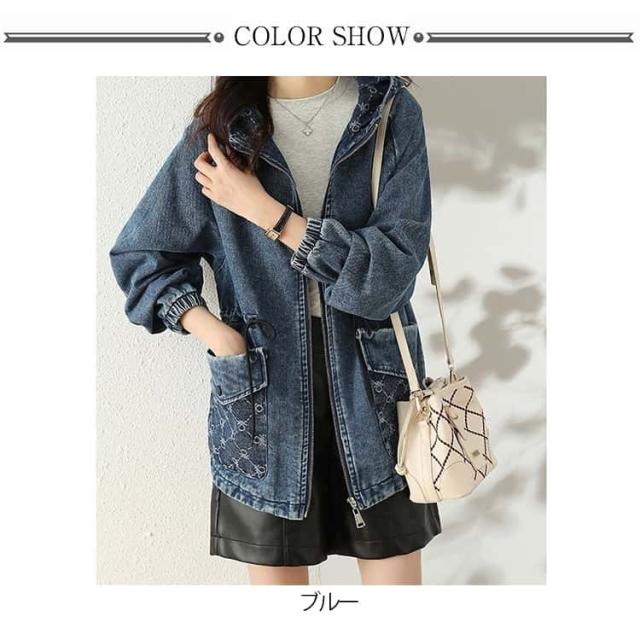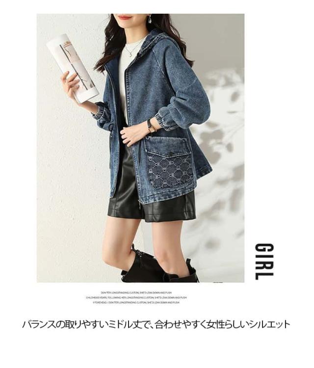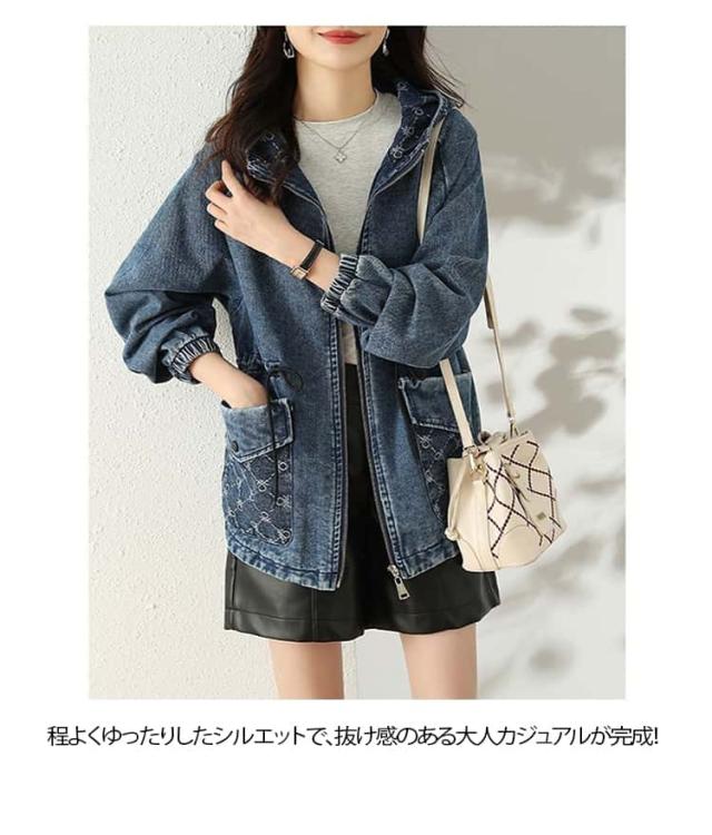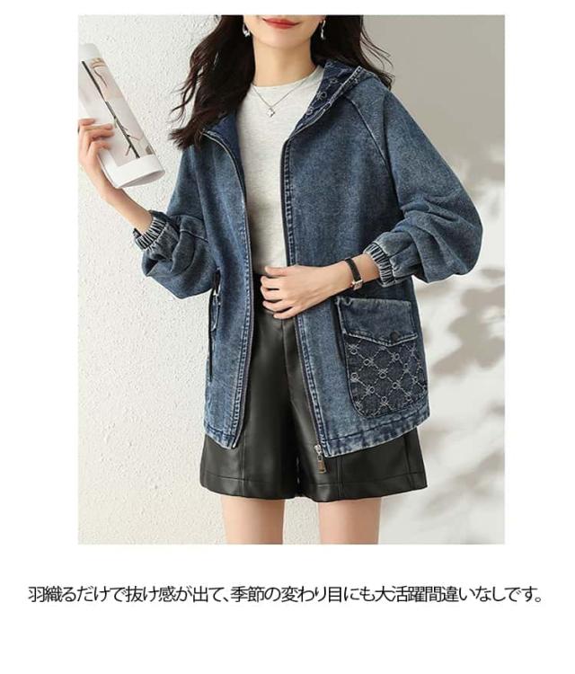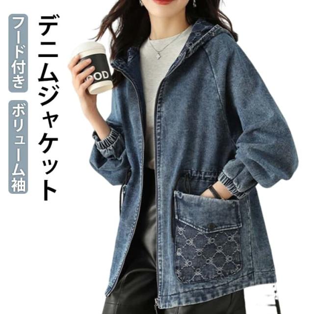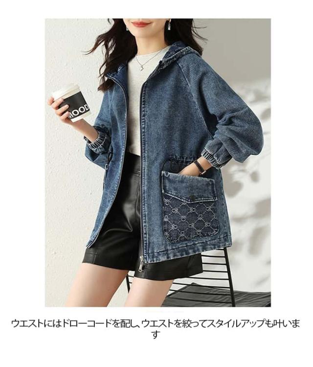 ジップアップ デニムジャケット ウエストドローコード 春 デニムジャケット Gジャン フード付き ジャケット レディース デニム デニムパーカー アウター 秋 薄手 ミドル丈 コート 大人 きれいめ ボリューム袖 ゆったり