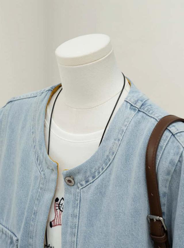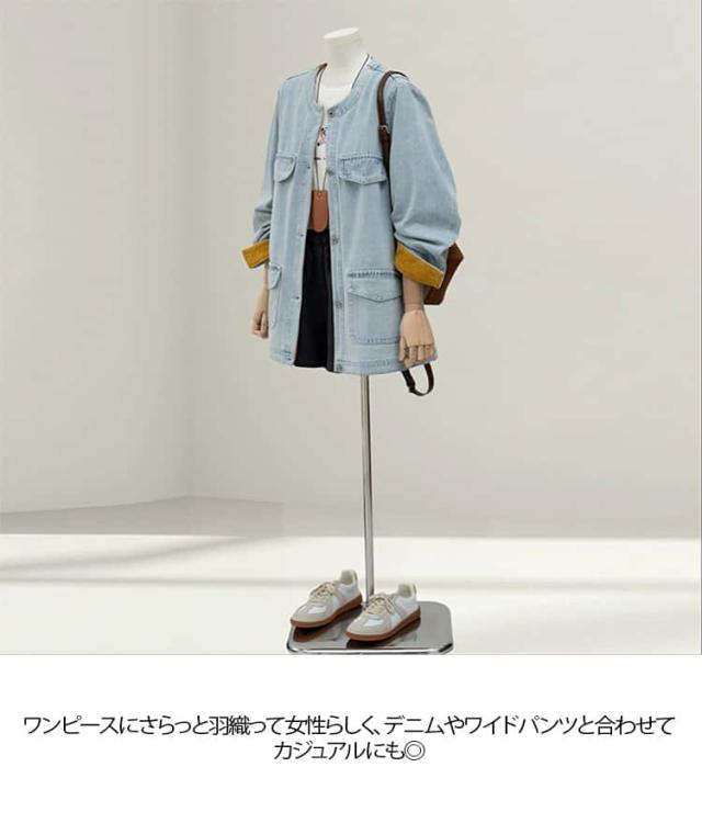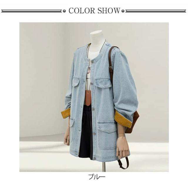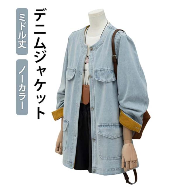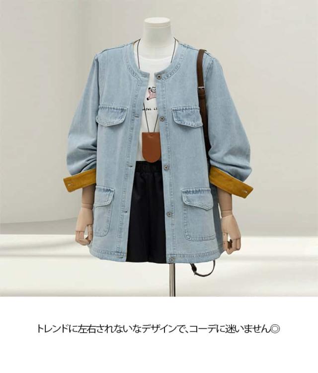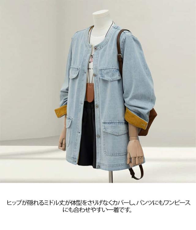 ロング丈 アウター Gジャン 薄手 ジャケット レディース 秋 ノーカラー デニムジャケット デニム ノーカラージャケット デニムコート デニムジャケット ラウンドネック ミドル丈 ライトジャケット 羽織り カジュアル ゆったり 大人