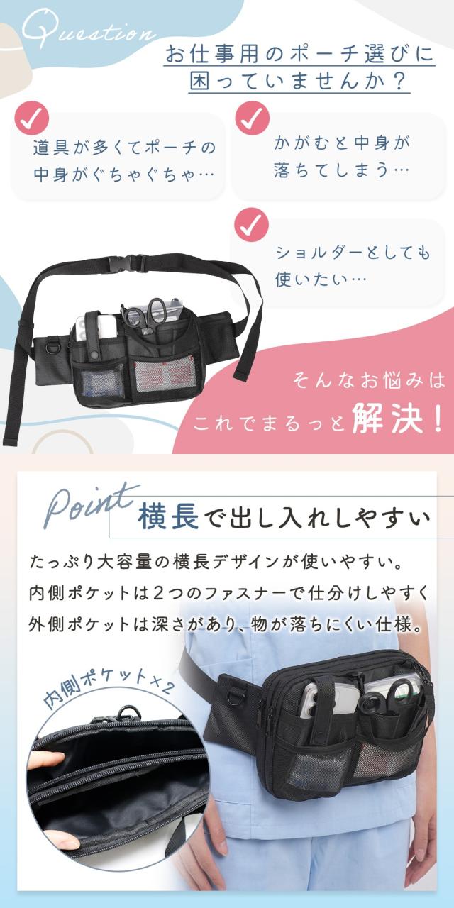 ナースポーチ/ウエストポーチ/ショルダーバッグ/2WAY/斜め掛け/肩掛け/ウエストバッグ/エプロンバッグ/オーガナイザー/多機能/横長/大容量/スリム/軽量/丈夫/長持ち/シンプル/おしゃれ/長さ調節/ファスナー/スマホ収納/小物収納/貴重品入れ/財布入れ/背面ポケット/Dカン/ベルトループ/位置固定/ズレにくい/多機能ポケット/仕分け収納/落ちにくい/撥水/オックスフォード生地/汚れに強い/業務用/仕事用/作業用/看護師/介護士/保育士/医療/介護/倉庫作業/清掃員/園芸/庭仕事/DIY/家掃除/ユニセックス