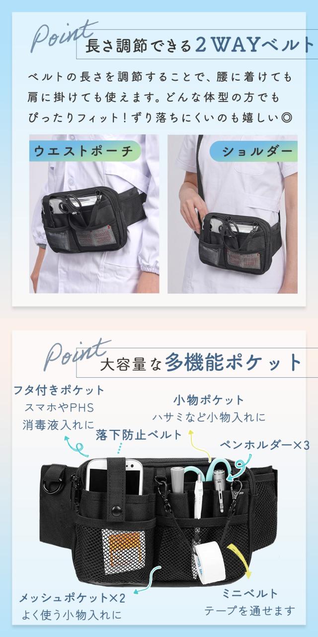 【MILASIC公式】ナースポーチ 多機能 ワイド 2WAY ウエストポーチ ショルダーバッグ オーガナイザー 大容量 軽量 撥水 スリム ファスナー スマホ 小物収納 貴重品入れ 背面ファスナーポケット Dカン 長さ調節 看護師 介護士 保育士 医療 介護 業務用 ユニセックス 多ポケット