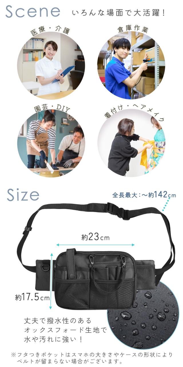 スマホやメモ、ペン類、スプレーボトルなど、仕事中によく使う小物をまとめて収納しやすい大容量仕様です。多機能ポケット付きで、細かな物も仕分けしやすく、必要な物をサッと取り出しやすい使い勝手の良さが魅力です。ワイドでスリムな形なので、たっぷり収納できるのに身に着けた時にもかさばりにくく、作業の邪魔になりにくい仕上がりです。