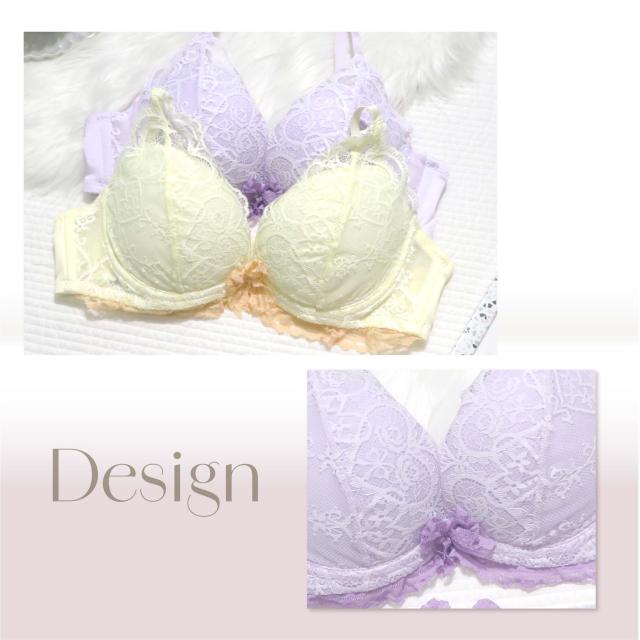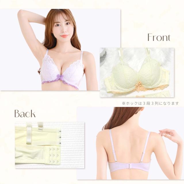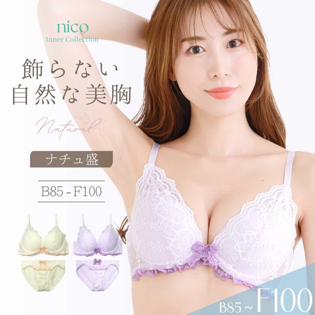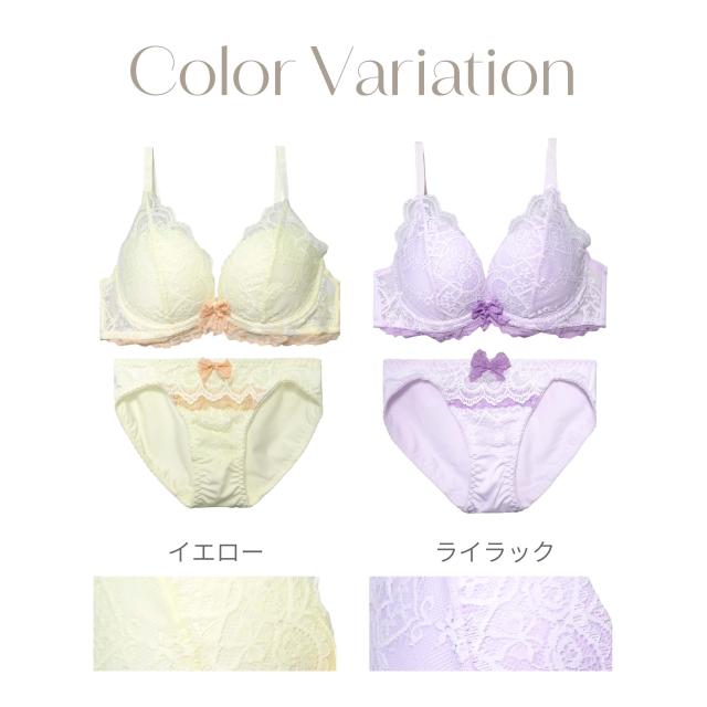 ハートと花束のデザインレースが可愛い♪ドーリーでロマンティックなブラセット。 ブラジャーは自胸を活かし自然な谷間を作るナチュ盛りシリーズ。ショーツはフルバックタイプ。