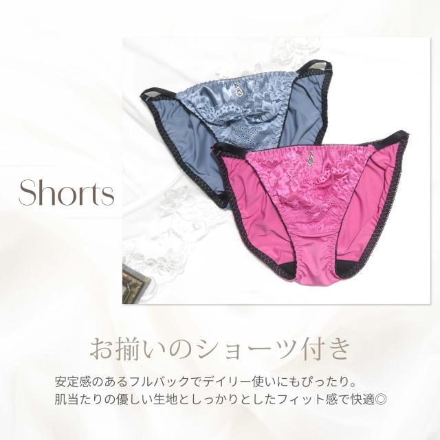 艶やかなジャカードサテンが大人の魅力を引き出し、魅惑的な雰囲気のブラセット。すっきりとしたボディシルエットをメイクする脇高シリーズ。 セットのショーツはフルバックタイプ。