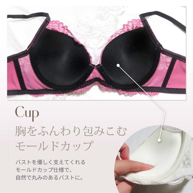 カップに咲く大柄レースが上品で、サテンとの相性も抜群◎