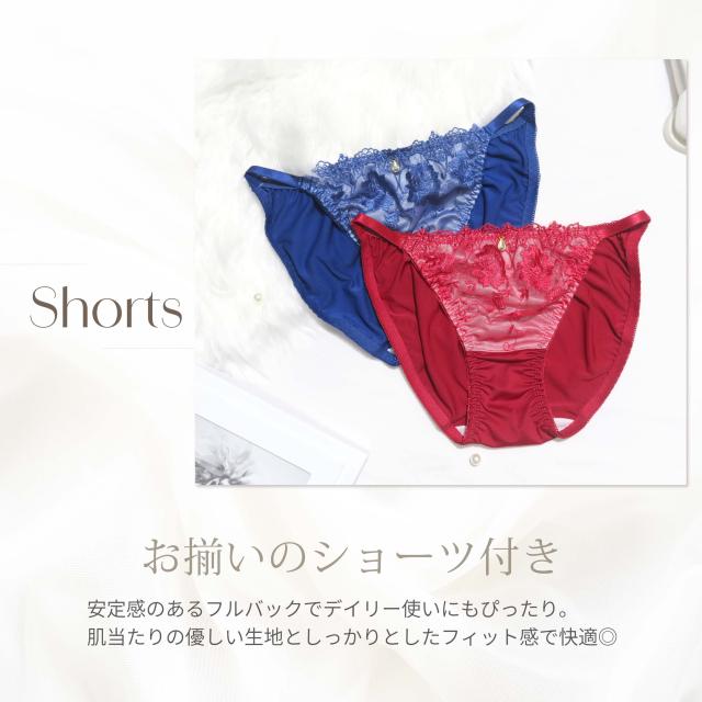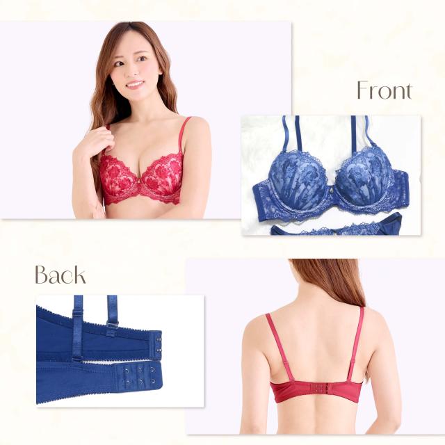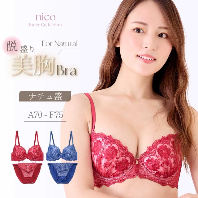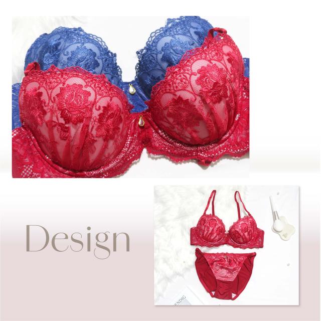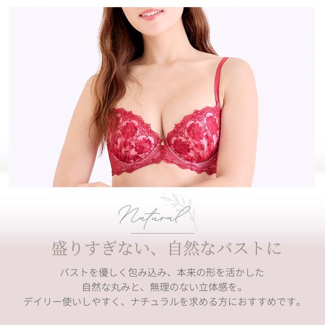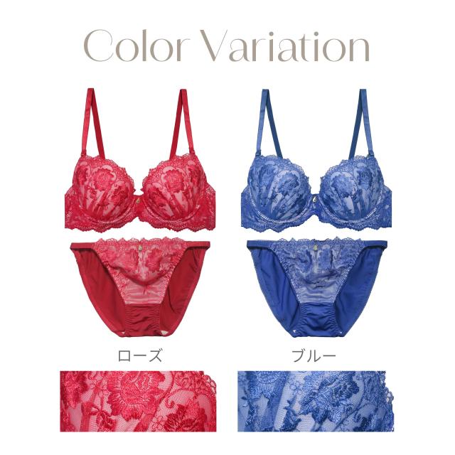 美しい濃色とローズの刺繍が大人なブラセット。ブラジャーは自胸を活かし自然な谷間を作るナチュ盛りシリーズ。ショーツはフルバックタイプ。