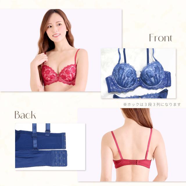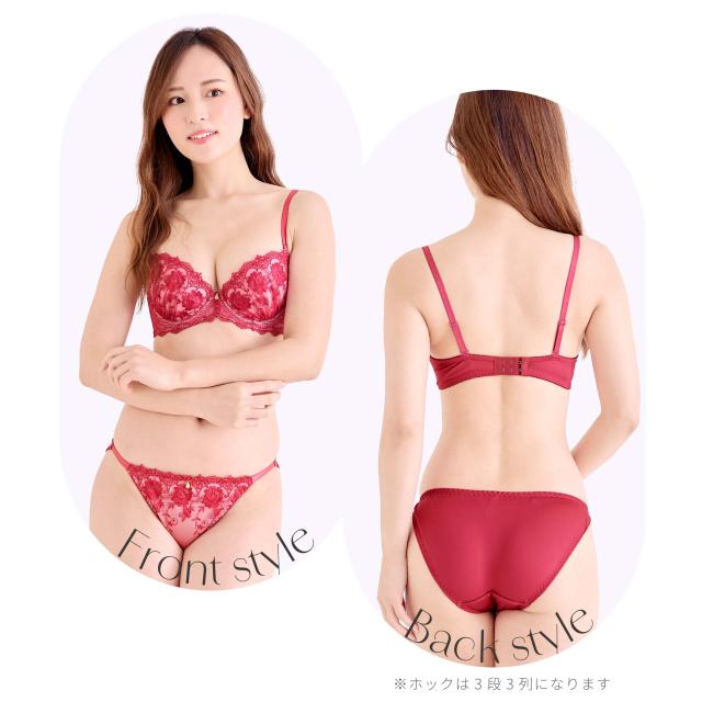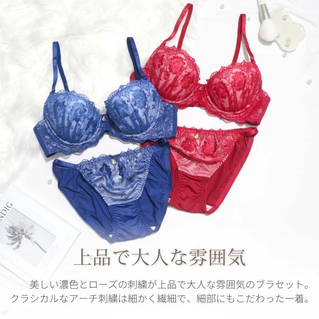 美しい濃色とローズの刺繍が大人なブラセット。ブラジャーは自胸を活かし自然な谷間を作るナチュ盛りシリーズ。ショーツはフルバックタイプ。
