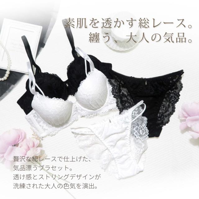 素肌を透かす総レースが、大人の気品を漂わせるブラセット。カップはハミ肉を防止し、すっきりとしたシルエットに見せる脇高シリーズ。お揃いショーツはストリング×透け感でセクシーに◎