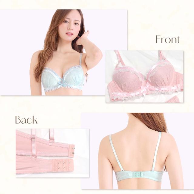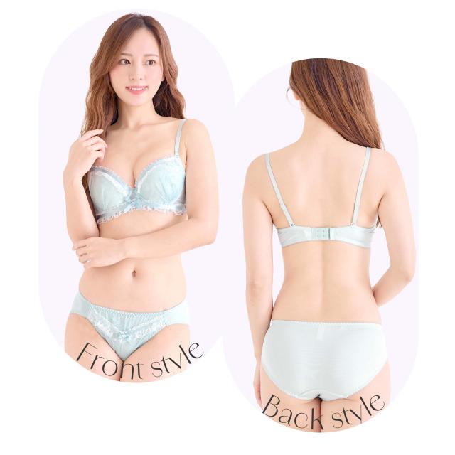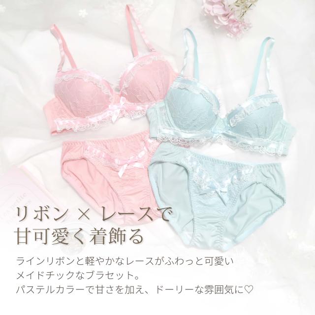 メイドチックなふわっと可愛い♪リボンとレースのブラセット。 ブラジャーは自胸を活かし自然な谷間を作るナチュ盛りシリーズ。ショーツはフルバックタイプ。