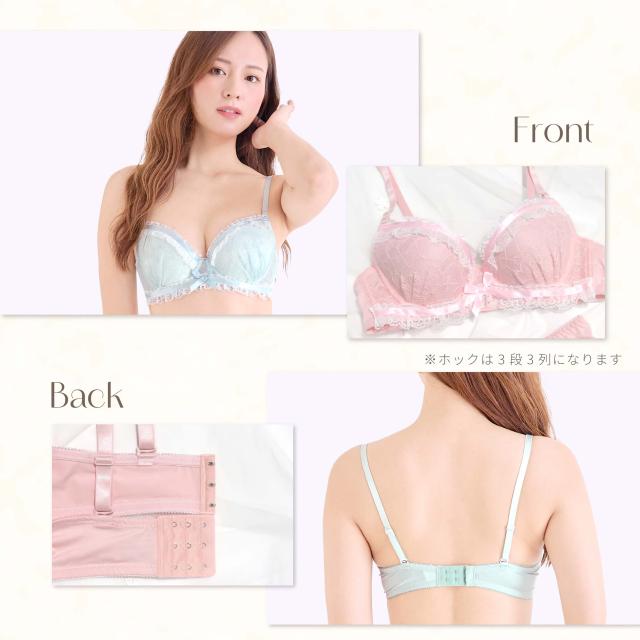 メイドチックなふわっと可愛い♪リボンとレースのブラセット。 ブラジャーは自胸を活かし自然な谷間を作るナチュ盛りシリーズ。ショーツはフルバックタイプ。
