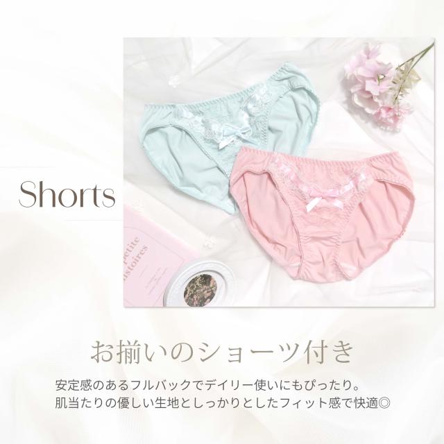 メイドチックなふわっと可愛い♪リボンとレースのブラセット。 ブラジャーは自胸を活かし自然な谷間を作るナチュ盛りシリーズ。ショーツはフルバックタイプ。