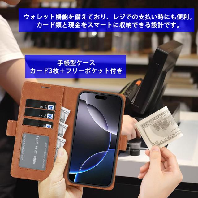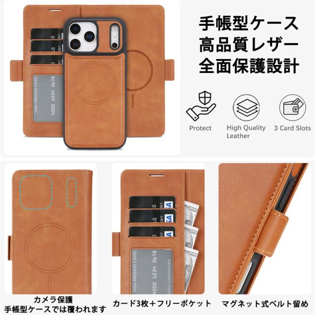 【2in1 マグネットケース】 強力な内蔵マグネットでスマホ部分はマグネットで簡単に取り外し可能です。 必要に応じてスマホ部分だけを簡単に取り外せる仕様で手帳型としてはカードや現金も収納でき、ビジネスシーンでもスマートに使えるデザインです。 【手帳型ケース】 カード3枚+フリーポケットには現金や領収書などを収納可能です。 手帳型の場合には背面カメラは覆われしっかり保護する設計になります。 しっかり閉じるマグネット式ベルト留めで安心です。 【Magsafe対応】 強力な内蔵マグネットの磁力による吸着で車載ホルダー等様々なMagsafeアクセサリーに対応しております。 【高品質】 ボタンやポートにぴったりフィットする精密な設計で、操作性も抜群です。 カメラ形状などは機種によって異なります。 |