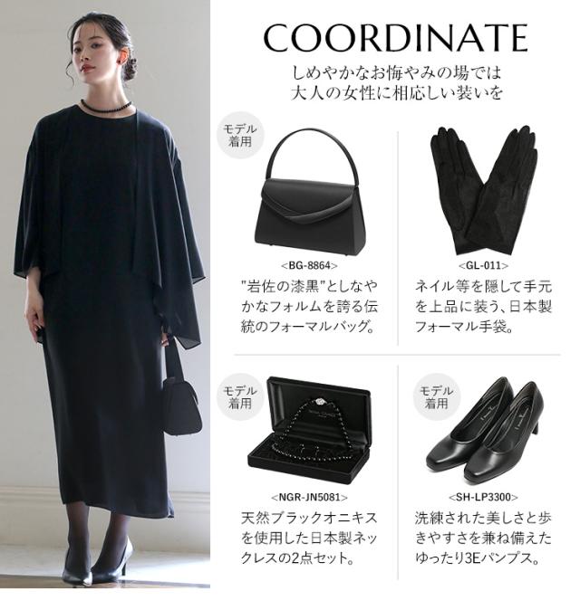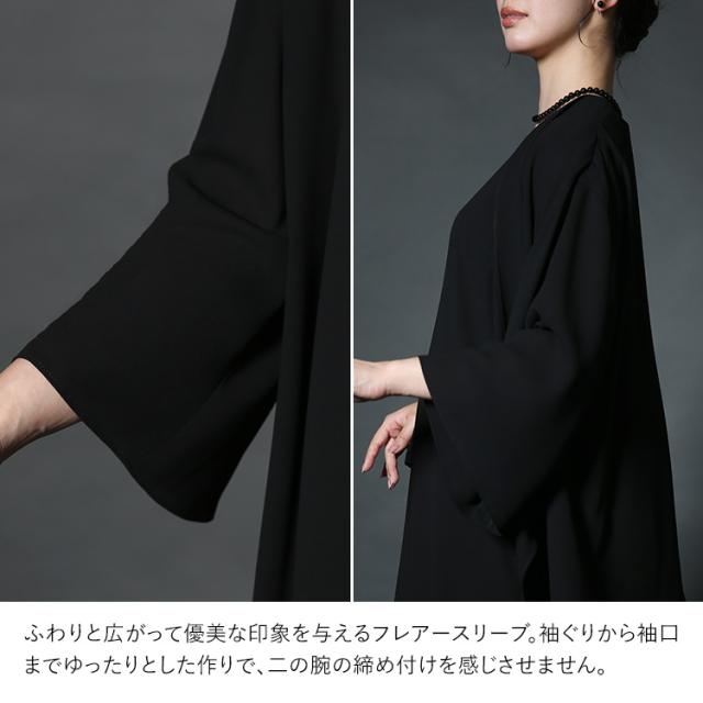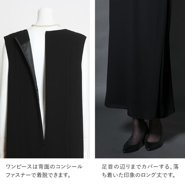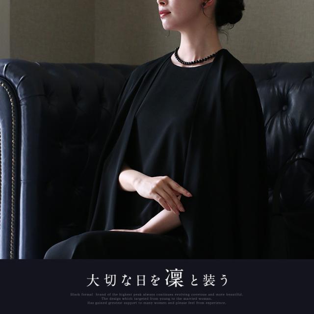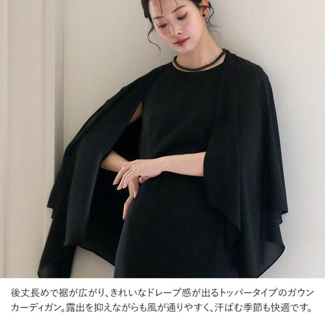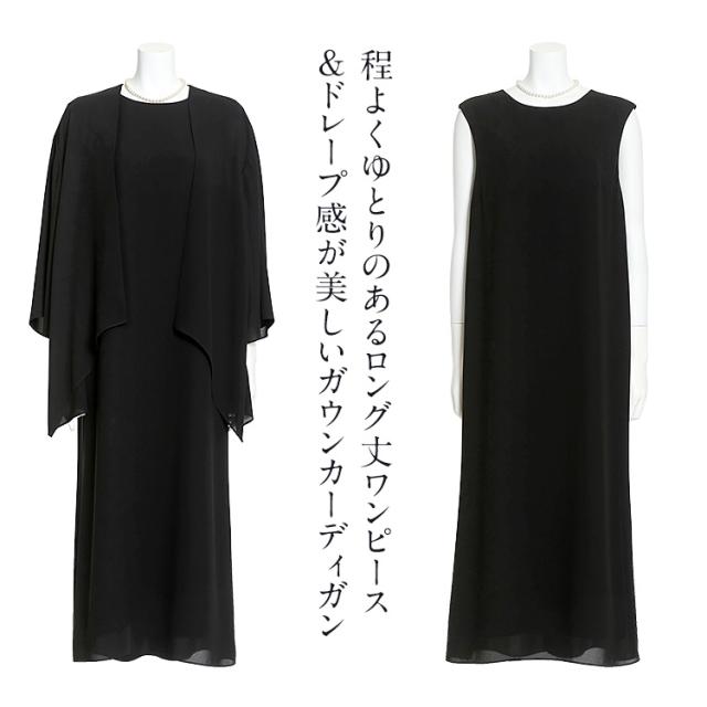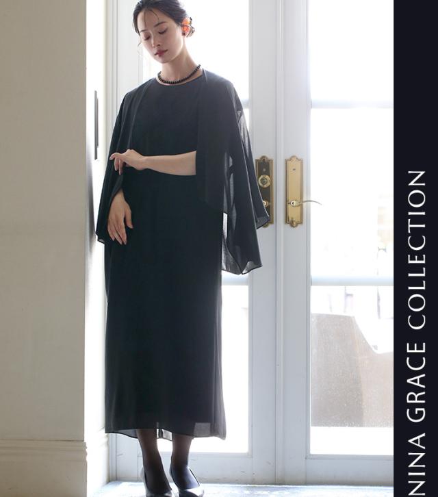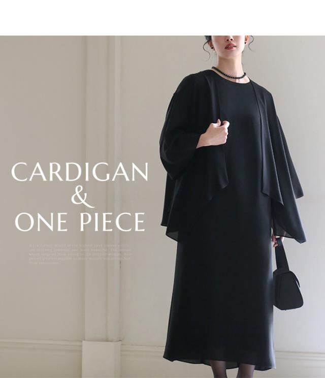 “身体のラインを拾わない”洗える夏のブラックフォーマル。ドレープ感が美しいガウンカーディガン&程よくゆとりのあるロング丈ワンピースのセットです。