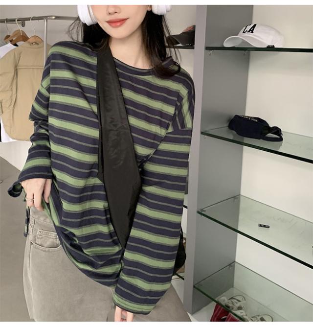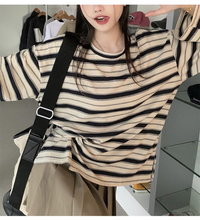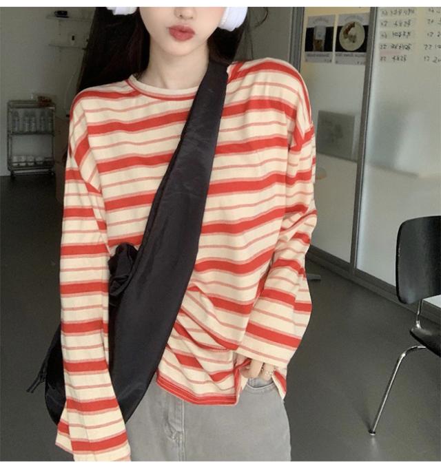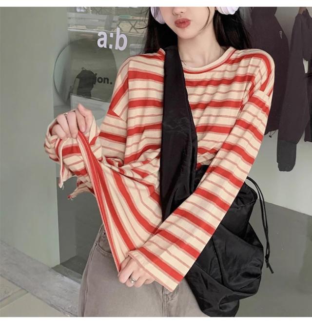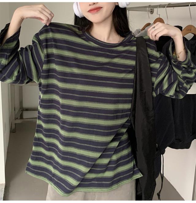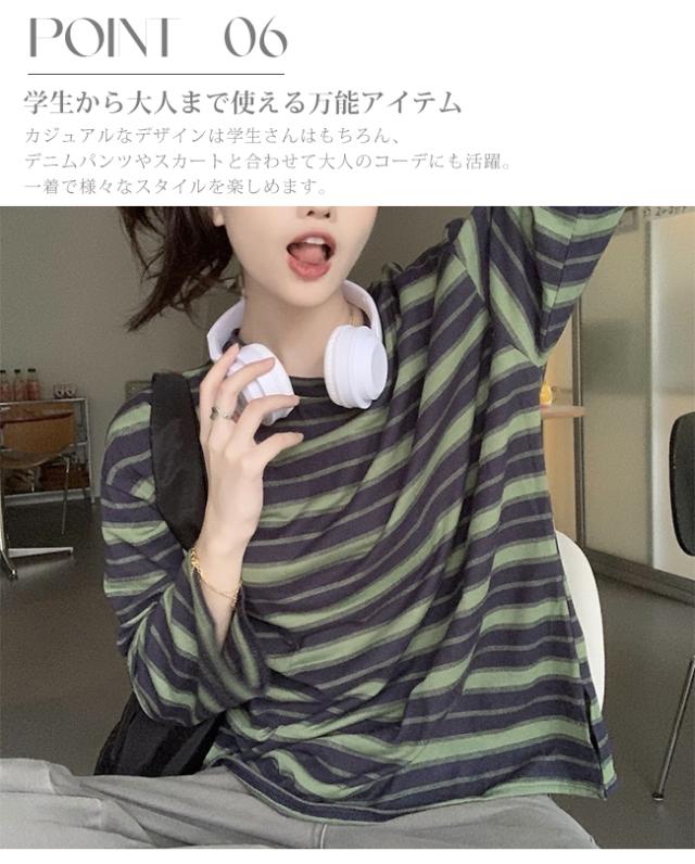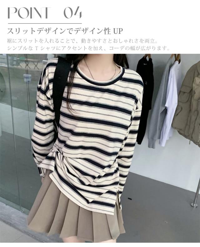 T シャツ ボーダー クルーネック長袖T シャツ レディース ルーズ スリム カジュアル スリット 可愛い