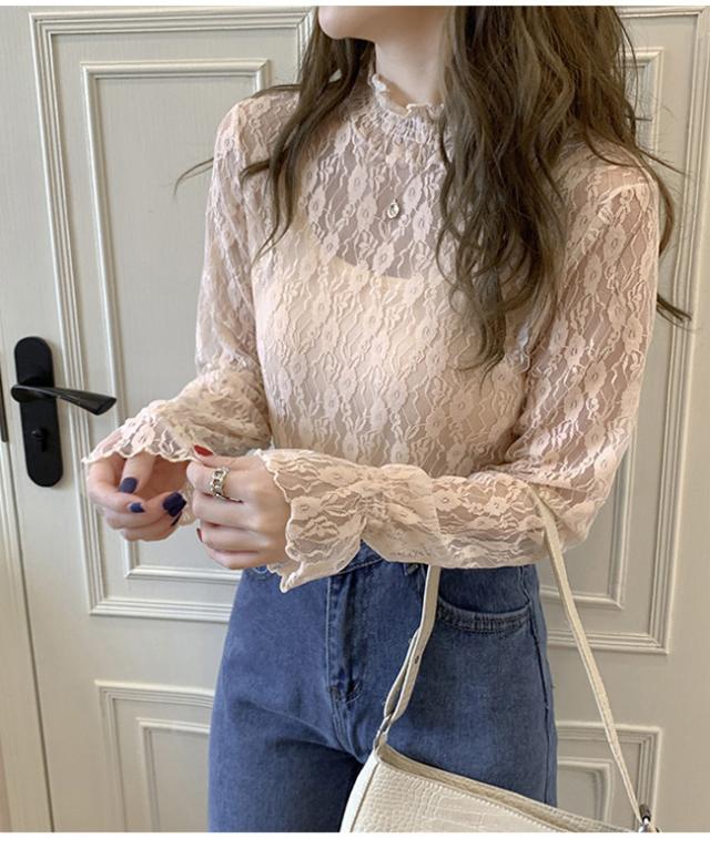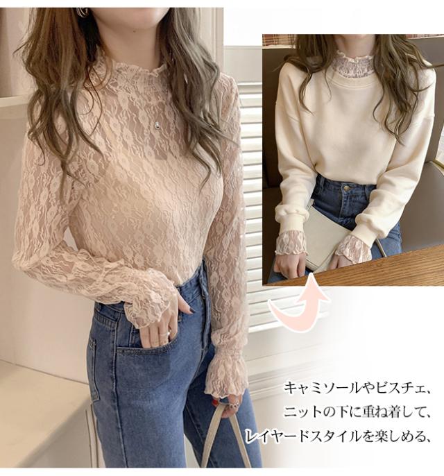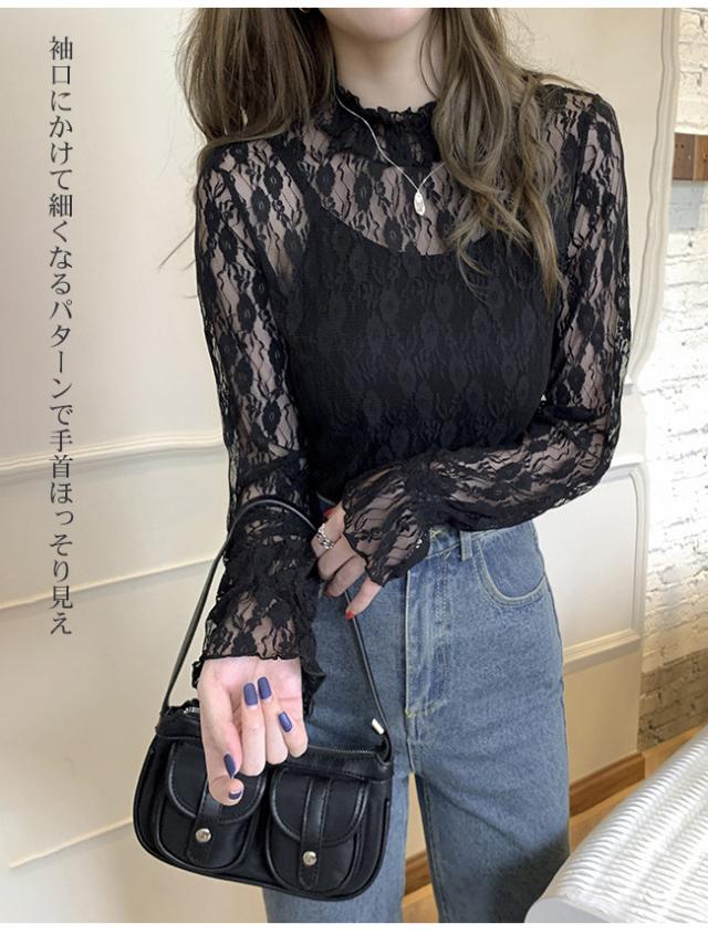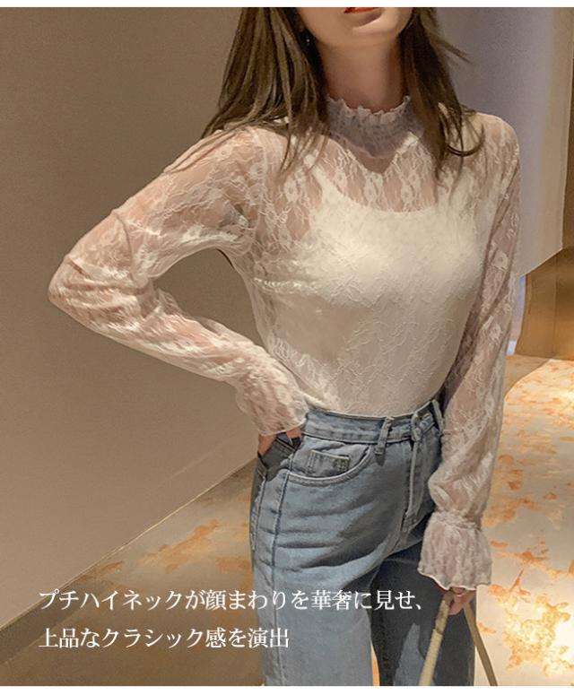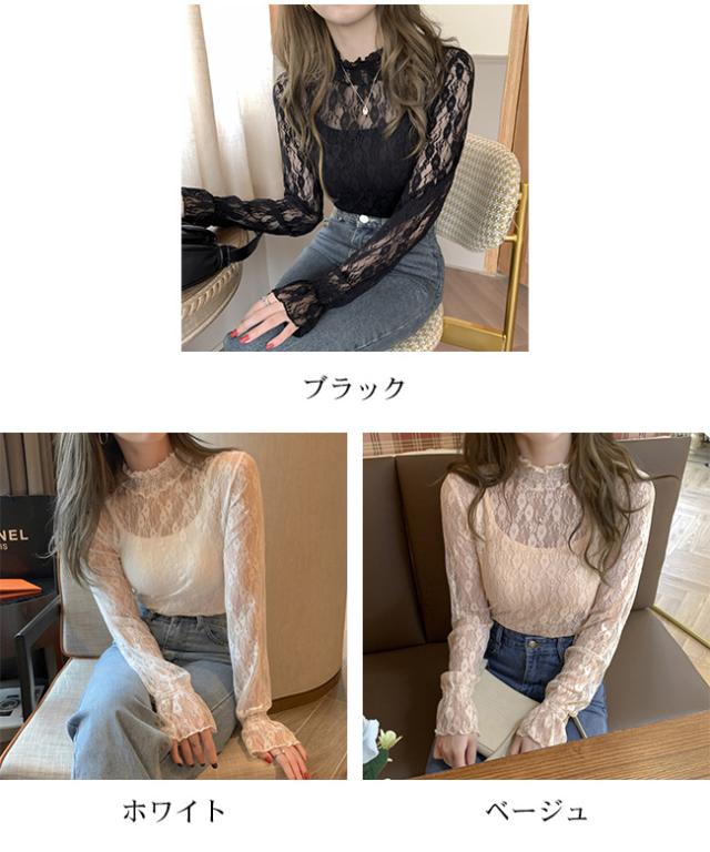 レース Tシャツ 透け感 フリル レディース シースルー トップス シアー トップス 長袖 ハイネック ロンT セクシー おしゃれ 大人 可愛い かわいい 肌見せ 小花 柄 きれいめ