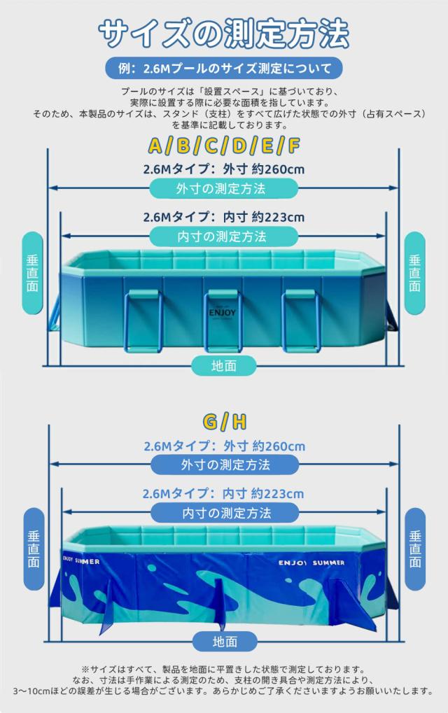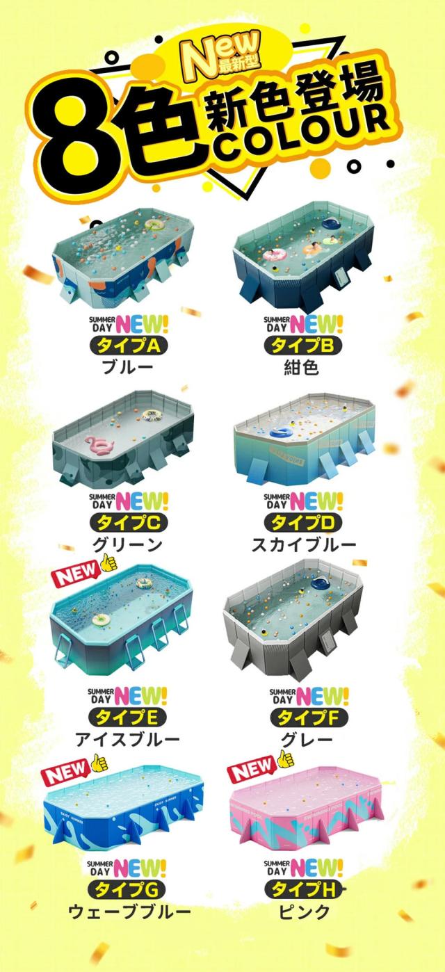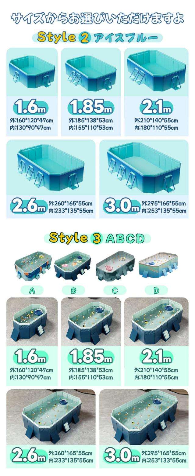 | 【商品説明】 | カラー:タイプA/B/C/D/E/F/G/H 素材: 100% PVC セット内容:プール本体*1 【サイズ】 1.6M:外寸:160×120×47cm 内寸: 130×90×47cm 適用人数:1-2人 1.8M:外寸:185×138×53cm 内寸:155×110×53cm 適用人数:1-3人 2.1M:外寸:210×140×55cm 内寸:180×110×55cm 適用人数:1-4人 2.6M:外寸:260×165×55cm 内寸:223×135×55cm 適用人数:1-6人 3.0M:外寸:295×165×55cm 内寸:253×133×55cm 適用人数:1-8人 4.0M:外寸:400×230×55cm 内寸:375×195×55cm 適用人数:1-12人 |