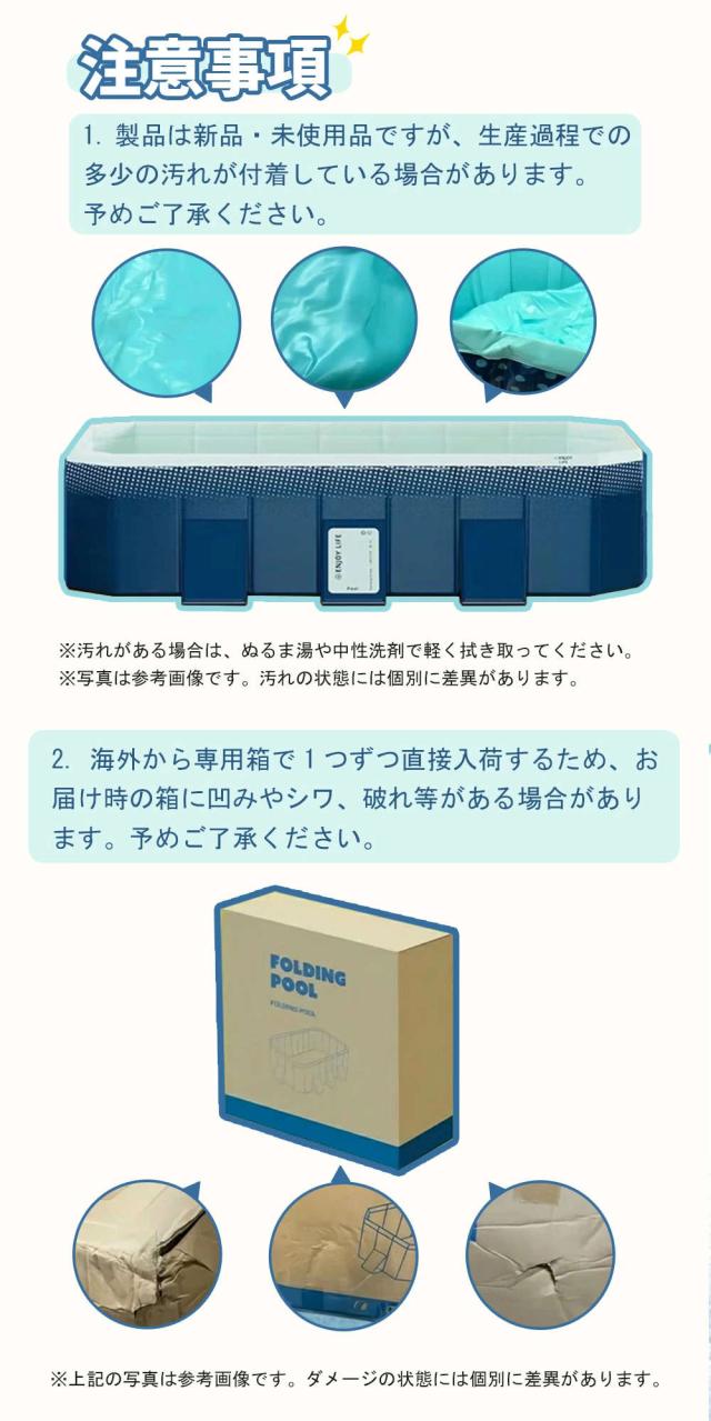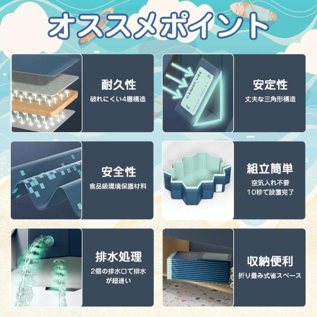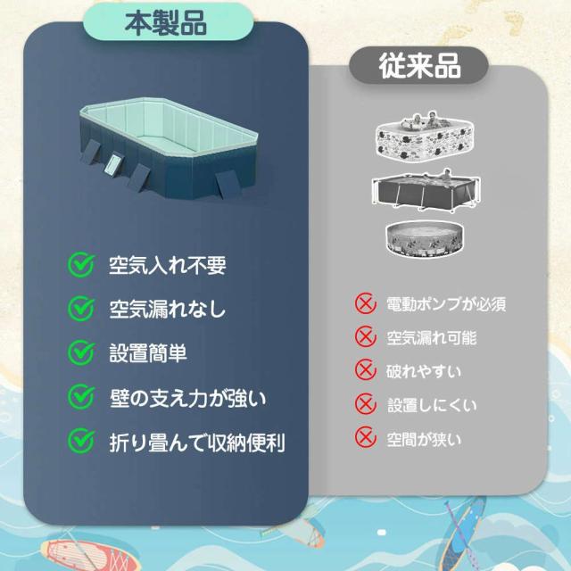 | 【特徴】 | 【使いやすさが魅力のプール】:折りたたみプール、組み立て不要、めんどな空気入れする必要がなく、穴が開いて萎んでしまう心配もございません!わざわざ高価な電動エアーポンプを購入する必要もない!屋外でも室内でも使える、暑い季節に大活躍!普段使わないときは、折りたたんでコンパクトに収納! 【滑り止め、ペットと子供に安全】: 折りたたみ式プールは、内壁と底の両方に厚い滑り止め素材を備えており、水を楽しんでいるときに滑りや落下を防ぎます。 子供用プールの側面では、子供やペットが簡単に飛び越えて水遊びを安全に行うことができます。 【様々な使い方】暑い夏は水遊びを楽しみます。寒い日は、プールにお子様のお気に入りのおもちゃを入れたり、カラーボールを入れたりして、遊び場になります。お子様が思う存分遊んでいただけます。自宅や公園など場所でも快適に遊べます 【広範な用途】:屋外プール、バスタブ、おもちゃの箱、1台3役で1年中使える!お子様の水遊び、大きな物を洗う、ペットバス、おもちゃ入れ、まだまだ多くの用途があります。屋内、お庭、ビーチ、屋外などいつでもどこでも簡単に使える。 |