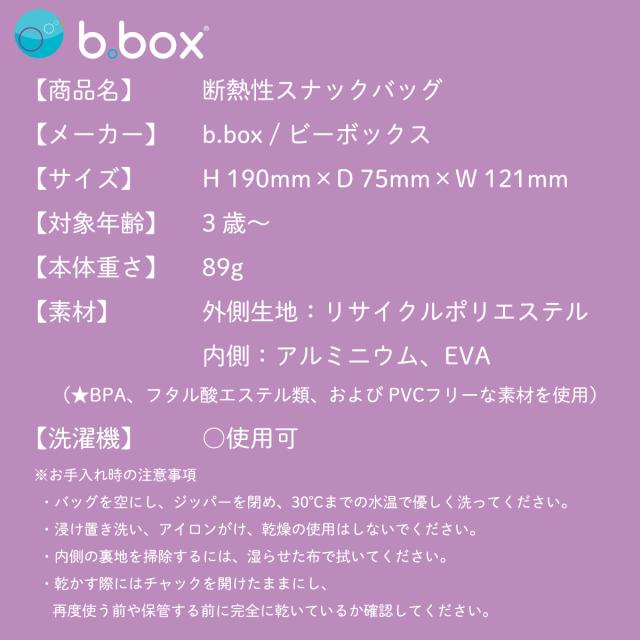ビーボックス b.box 断熱性スナックバッグ snackbag スナックボックス ランチバッグ 洗濯可 お弁当袋 お弁当 弁当箱 遠足 おでかけ 子ども キッズ スナックボックス用 保冷バッグ 断熱ランチバッグ 洗濯機OK 断熱 保冷 カラフル