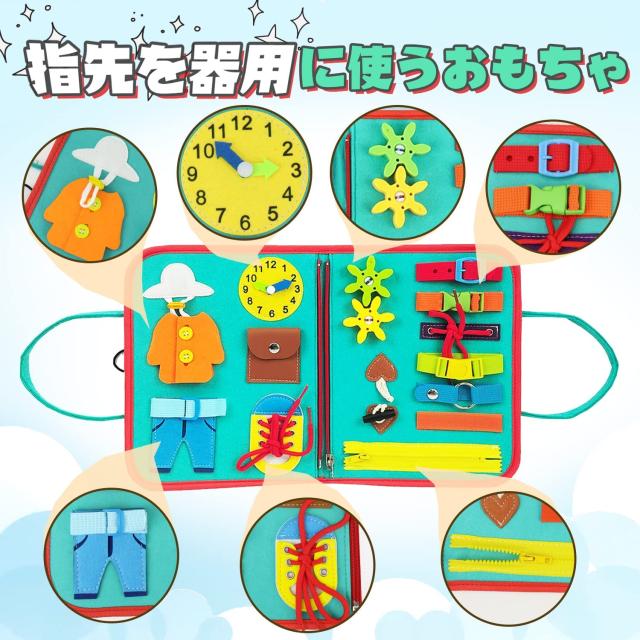 豊かなボタン、バックル、靴紐、ジッパーなどで遊べる、「ビジーボード」と呼ばれる知育用玩具です。一般に洋服についている留め具をまとめてあるオモチャで、子供の知力、創造性を刺激し、能力の開発に役立ちます。