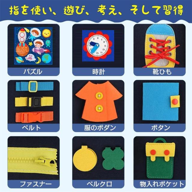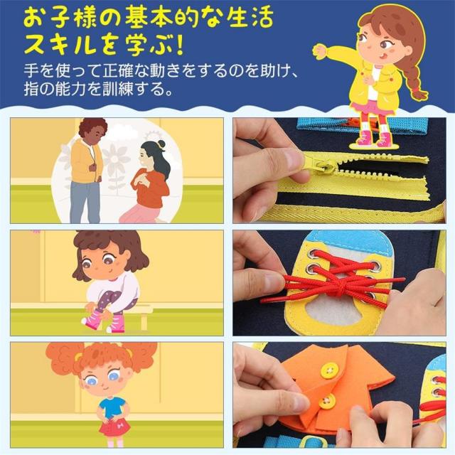 衣類のよく使われている留め具、ボタンなどを網羅しており、お子様のお着替えの練習に役立ちます。