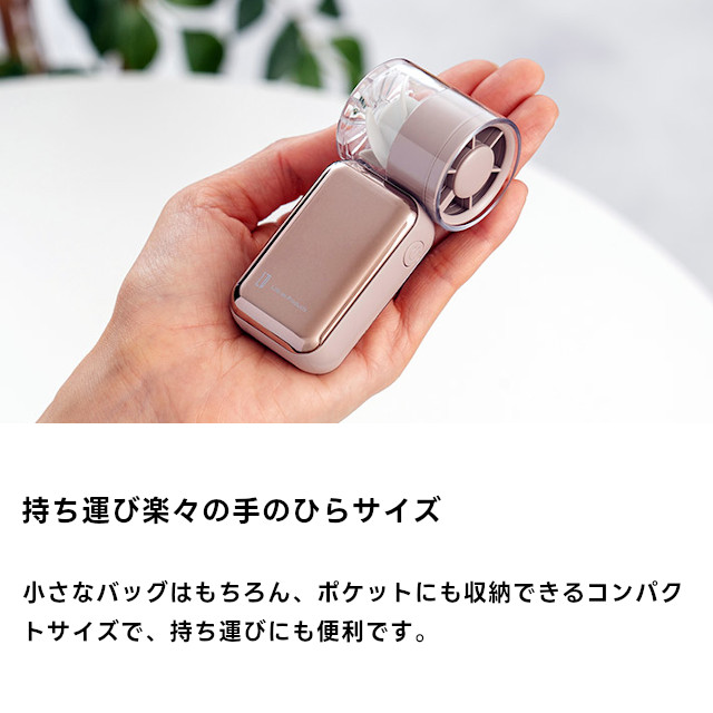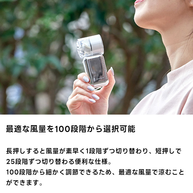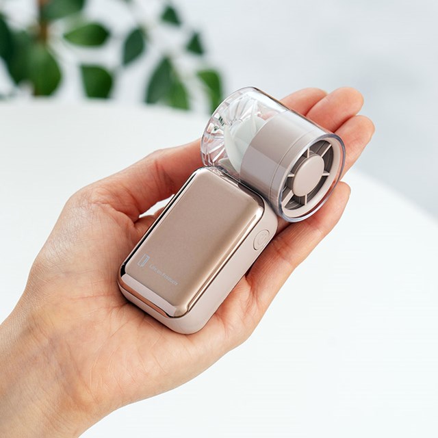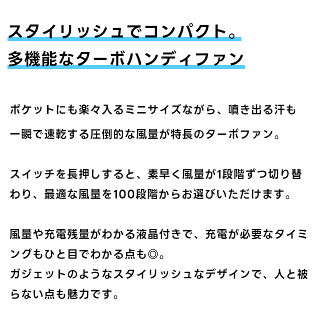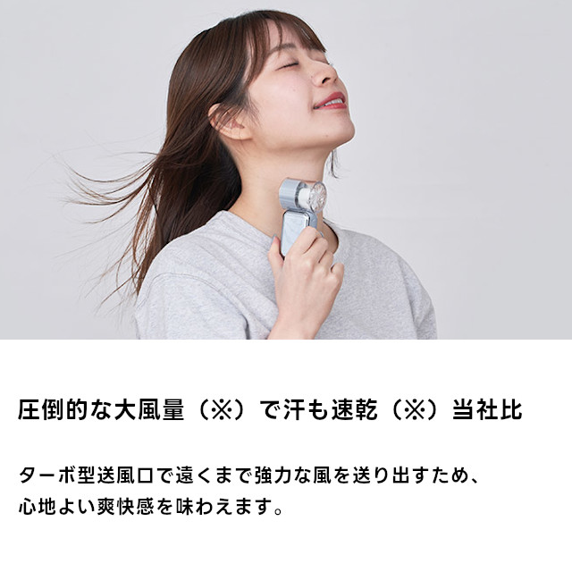 ポケットにも楽々入るミニサイズながら、噴き出る汗も一瞬で速乾する圧倒的な風量が特長のターボファン。