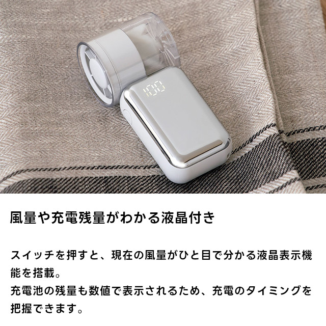 風量や充電残量がわかる液晶付きで、充電が必要なタイミングもひと目でわかる点も◎。