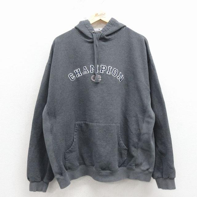 古着 長袖 チャンピオン Champion スウェット パーカー メンズ 00年代 00s ビッグロゴ 刺繍 大きいサイズ 濃グレー 霜降り 26feb28