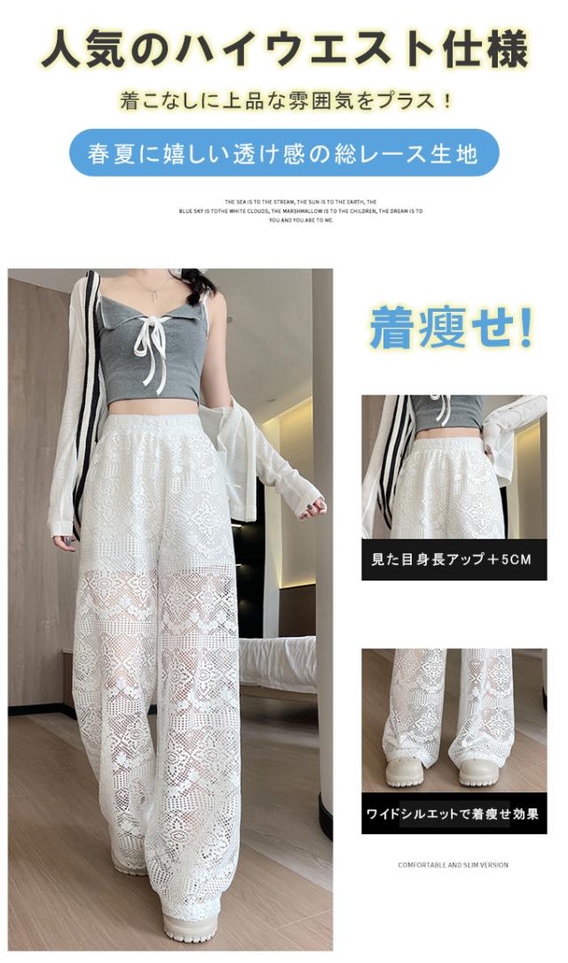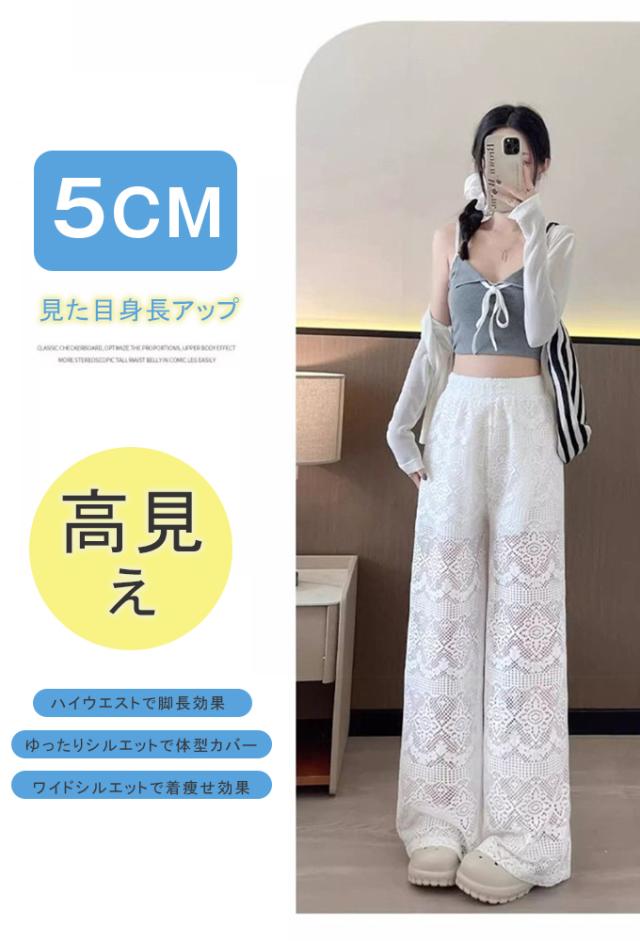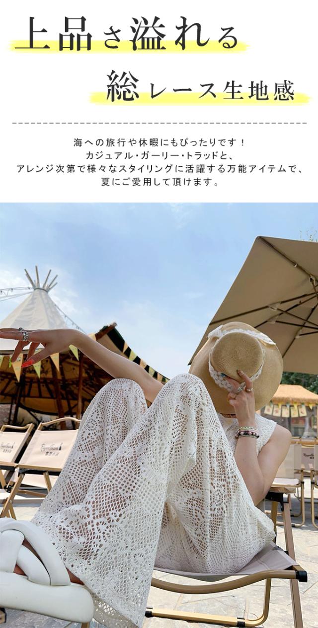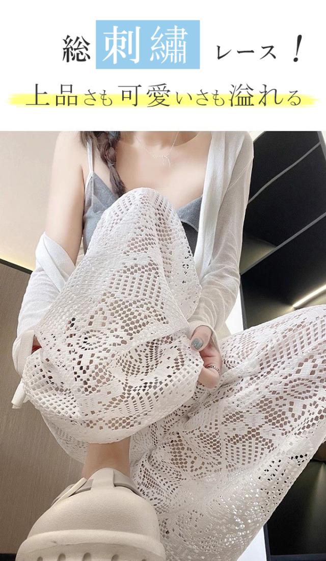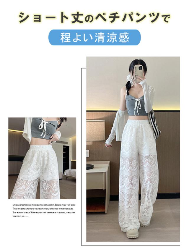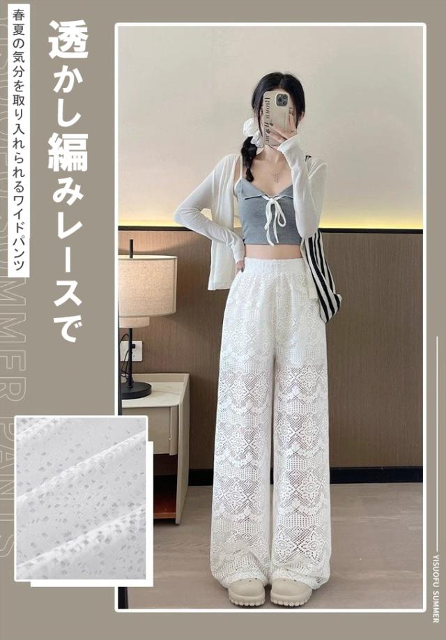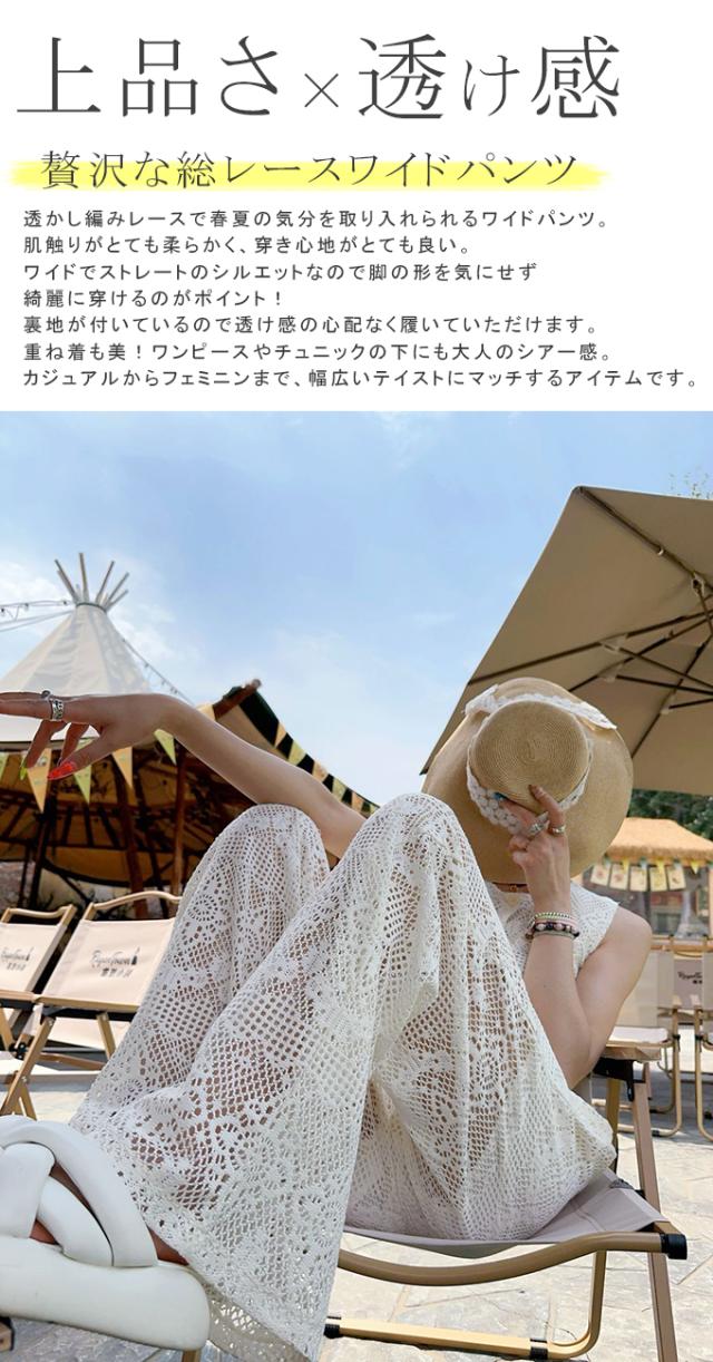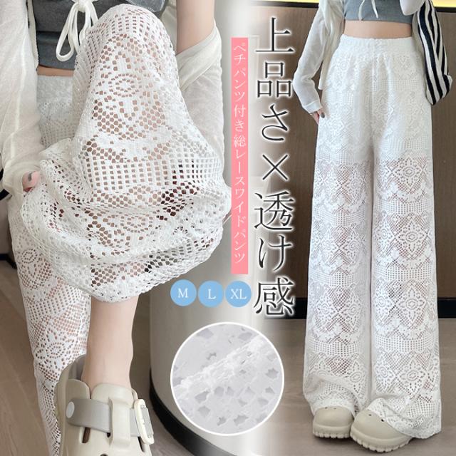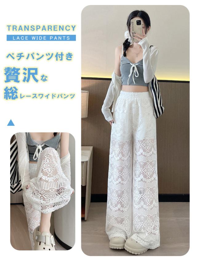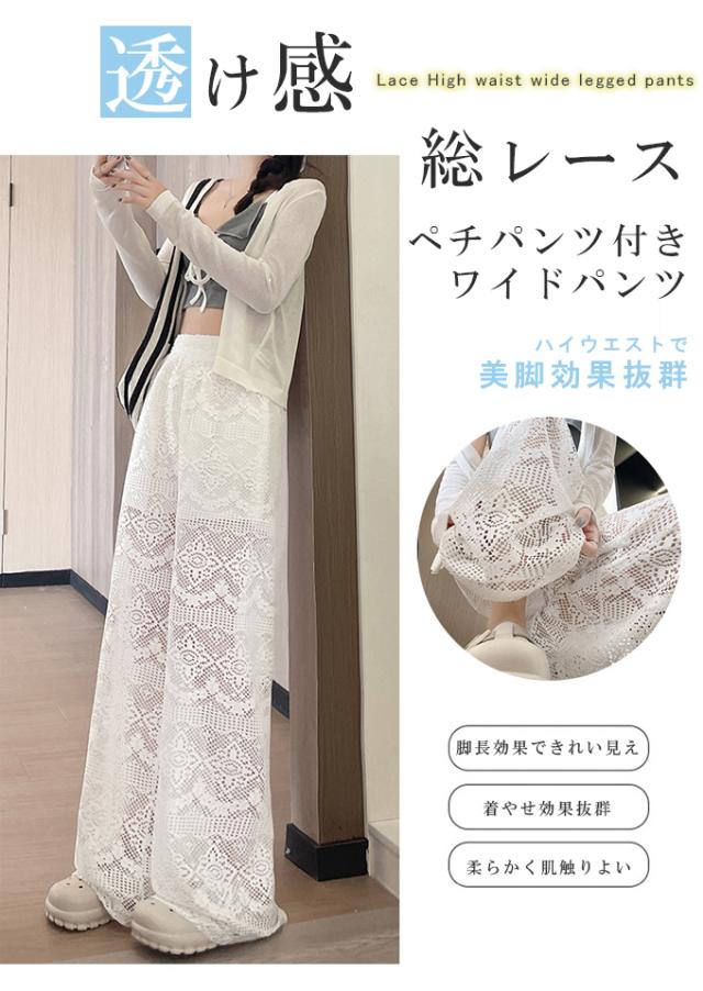 ワイドパンツ 総レース レディース ペチパンツ付き シアー 美脚効果 透け感 着痩せ 涼しい 薄手 ロング パンツ 夏 ボトムス