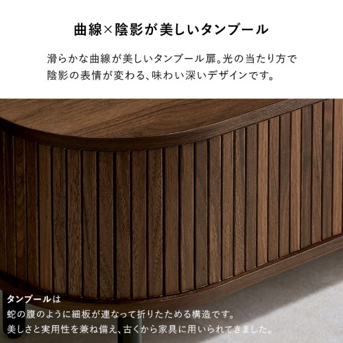 | 【商品紹介】 縦のラインとサイドの曲線が美しいタンブール扉のテレビ台。扉の開閉に場所を取らず、すっきりとした脚高デザインもポイントです。ローボードとしても使用可能 |