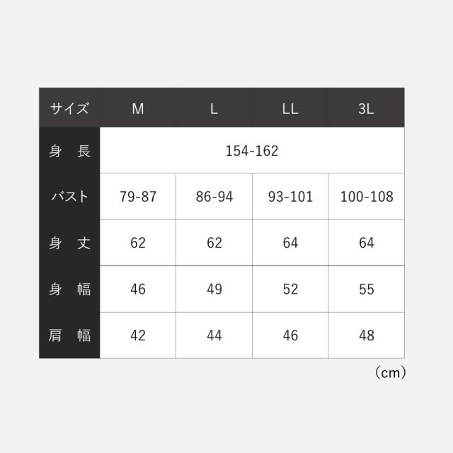■サイズ:身長154-162、M/バスト79-87、身丈62、身幅46、肩幅42、L/バスト86-94、身丈62、身幅49、肩幅44、LL/バスト93-101、身丈64、身幅52、肩幅46、3L/バスト100-108、身丈64、身幅55、肩幅48cm
