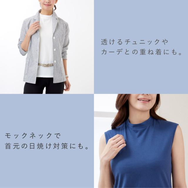 首元は、少し高さのあるモックネックデザイン。詰まりすぎず、首まわりをやさしく包み込みながら、気になる首筋をさりげなくカバーしてくれます。夏の首元の日差し対策にも使いやすく、上品ですっきりとした印象に見せてくれるのも魅力です。