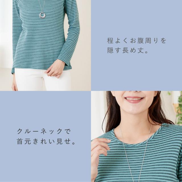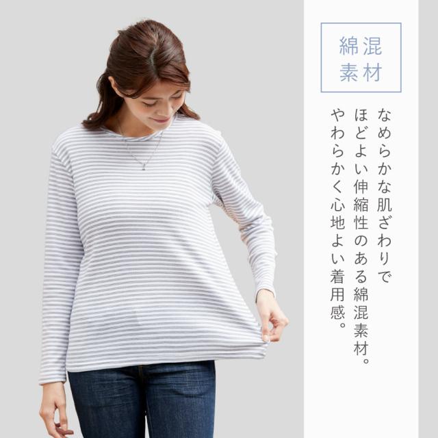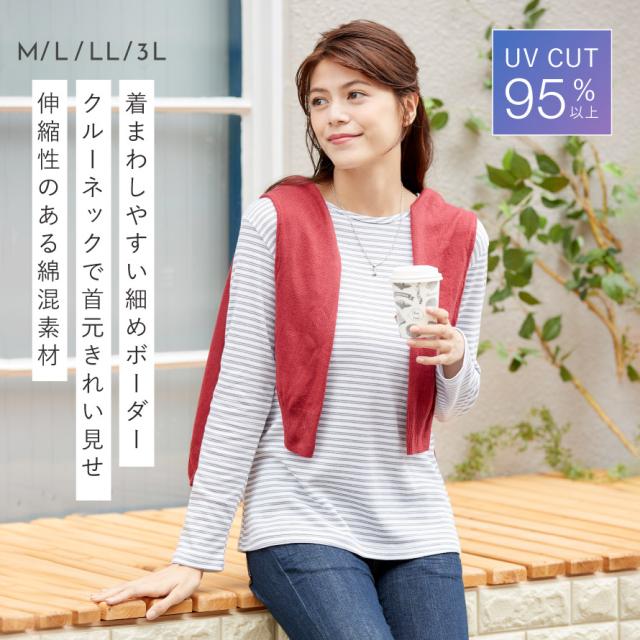 カットソー レディース 長袖 ボーダー 綿混 UVカット M L LL 3L ゆったり 大きいサイズ 50代 60代 70代 ミセス シニア 長め丈 体型カバー クルーネック インナー 重ね着 柔らか綿混クルーネックボーダー メール便対応