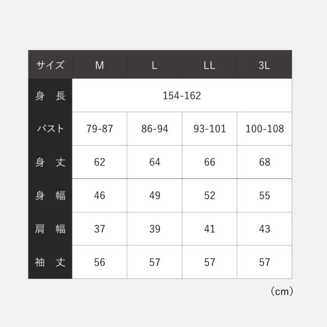 ■サイズ:身長154-162、M/バスト79-87、身丈62、身幅46、肩幅37、袖丈56、L/バスト86-94、身丈64、身幅49、肩幅39、袖丈57、LL/バスト93-101、身丈66、身幅52、肩幅41、袖丈57、3L/バスト100-108、身丈68、身幅55、肩幅43、袖丈57cm