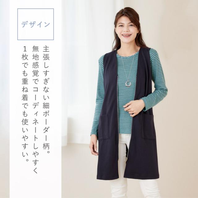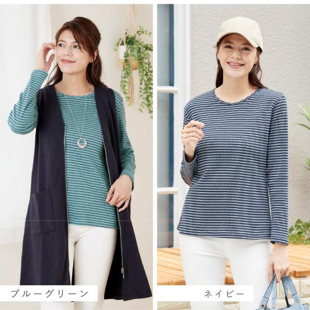 主張しすぎない細ボーダー柄で、無地感覚でコーディネートしやすく、50代・60代・70代のミセス世代にも取り入れやすいデザイン。1枚でさらりと着るのはもちろん、ベストやカーディガン、ジャケットのインナーとしても使いやすく、季節の変わり目から長く活躍します。